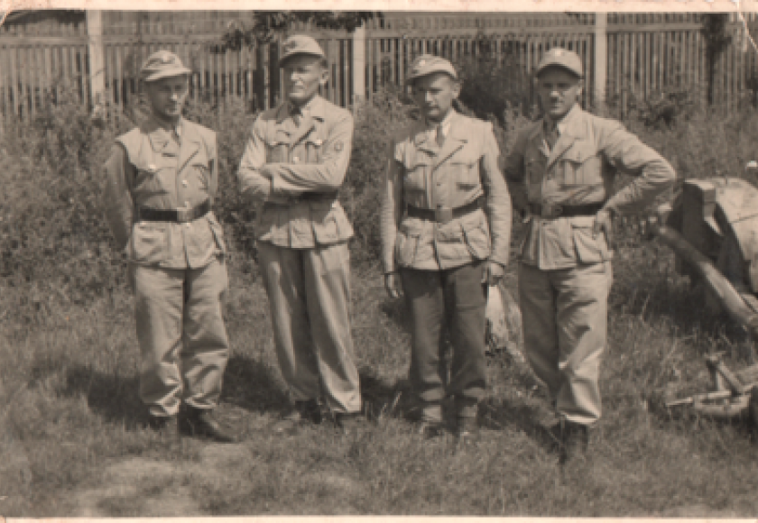 Josef Křivka s ostatními kolegy - vojáky v poválečných Podbořanech - 1. zprava, vedle něj 2. zprava Theodor Zajíc, 1. zleva Boris Stránský.