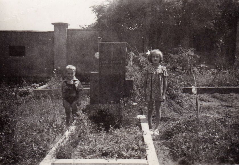 Pravnoučata Pepík a Jaruška u hrobu Anny Knopové, roz. Křesinové (datum odhadem) na hřbitově Výškov, který je společný pro obyvatelé Výškova a Počerad.
