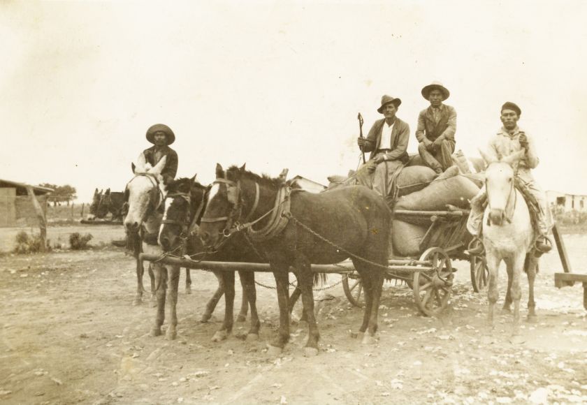 23.4.1936 - na pytlích s bavlnou s bičem v ruce - Laďa Langr (ostatní jsou místní) přijeli prodat úrodu. Zcela vlevo je vidět část váhy.