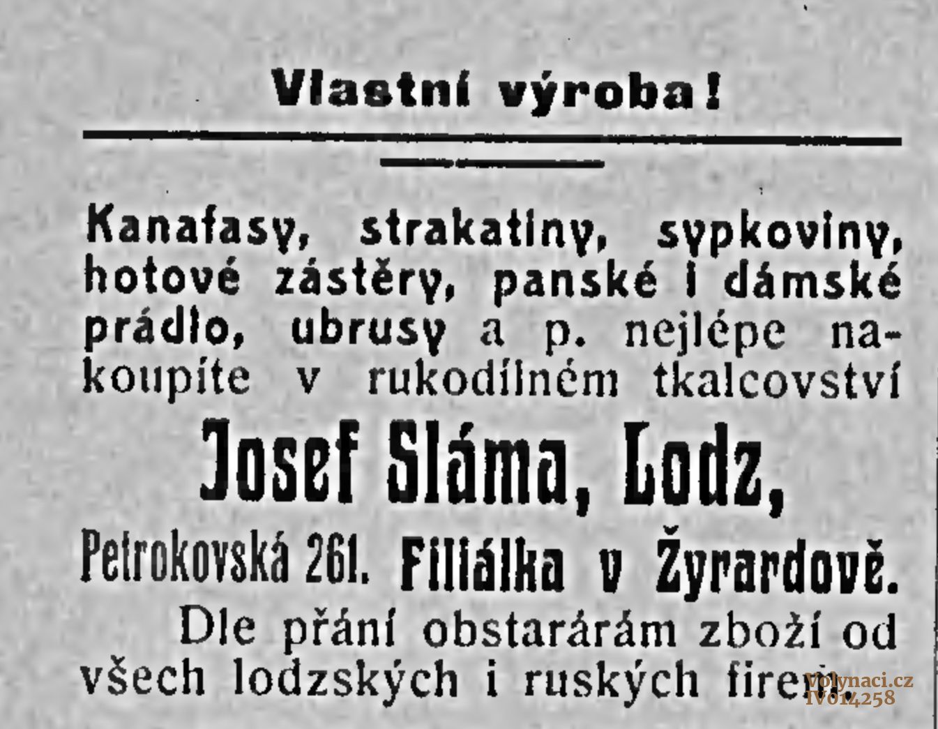 Inzerát tkalcovství Josef Sláma