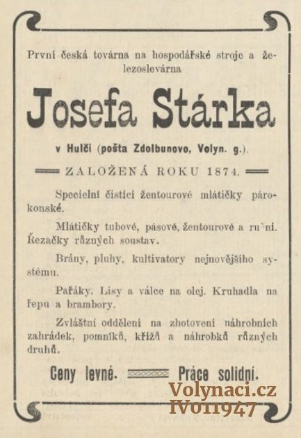 První česká strojírna a slévárna na Volyni byla zřízena již v roce 1874 v Hulči Josefem Stárkem. Vyráběla především zemědělské stroje: speciální čistící žentoury, žentourové mlátičky, brány, řezačky, pluhy, kultivátory, pařáky, lisy a kruhadla.(Jaroslav Vaculík - Dějiny Volyňských Čechů I. 1868-1914) Související archiválie