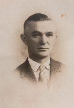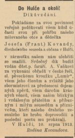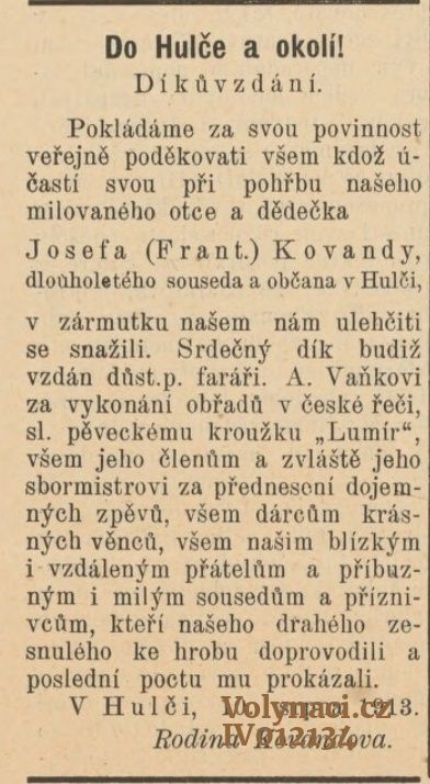 Nekrolog Josefa Františka Kovandy z Hulče na Volyni. Obřad vykonal pan farář A.Vaněk za doprovodu pěveckého kroužku "Lumír".