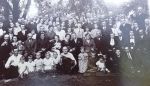 Společná fotografie obyvatel Hulče, při návštěvě jejich rodáka, který přijel z Ameriky (silnější pár sedící v řadě za dětmi).
