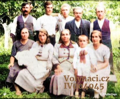 Stojící muži zleva: Josef Prajzent, Josef Křivka, Josef Prajzent, Josef Křivka, Václav Šimůnek. Sedící ženy s dětmi zleva: Zdena Prajzentová roz. Šimůnková, Nina Křivková roz. Prajzentová se synkem Evženem Křivkou, Anna Křivková roz. Otčenášková, Antonie Šimůnková roz. Křivková se synem Mstislavem Šimůnkem.