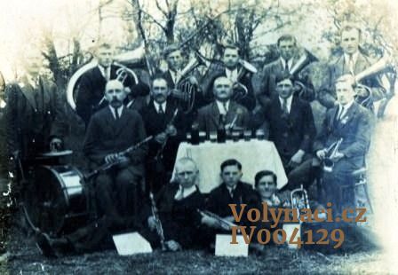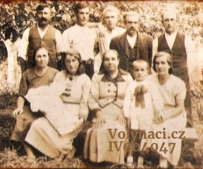 Stojící muži zleva: Josef Prajzent, Josef Křivka, Josef Prajzent, Josef Křivka, Václav Šimůnek. Sedící ženy a děti zleva: Zdena Prajzentová roz. Šimůnková, Nina Křivková roz. Prajzentová se synkem Evženem Křivkou, Anna Křivková roz. Otčenášková, Antonie Šimůnková roz. Křivková se synem Mstislavem Šimůnkem