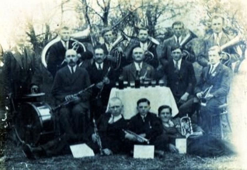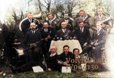 Kolorovaná fotografie, Josef Křivka v ivaničské kapele - ležící 1. zprava (s křídlovkou), 30. léta 20. století