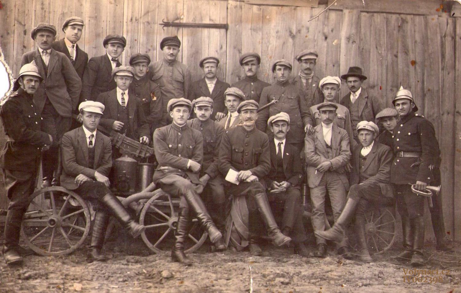 Hasiči v Kupičově v době před uniformami. Druhý zleva sedící na kole je Josef Čurda datum odhadem