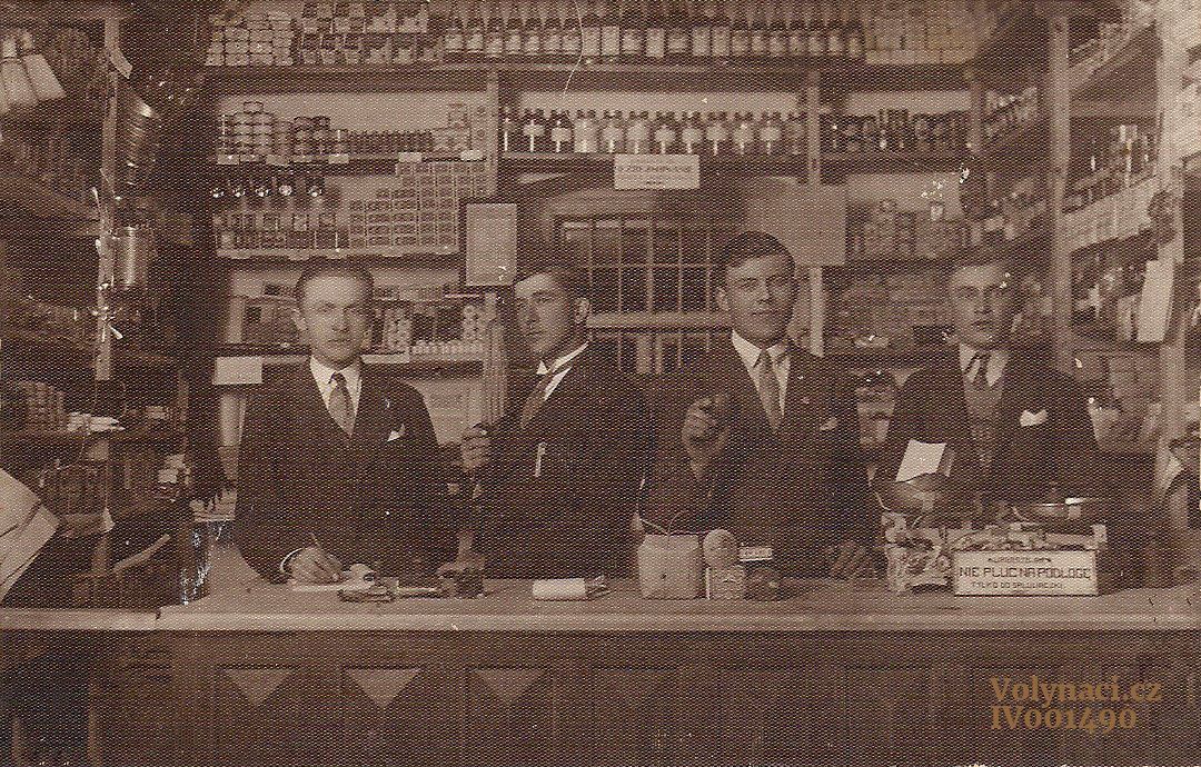 Prodejna -Kooperativa Kupičov odleva: Josef Tošner, Josef Čurda,Václav Vrla,Bohuslav Hálek. Letopočet fotografie krámku odhadem