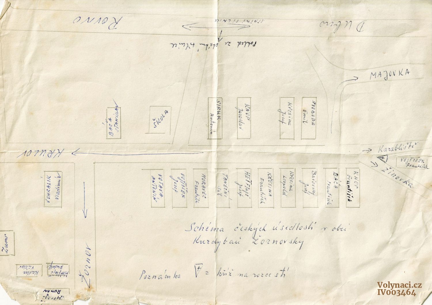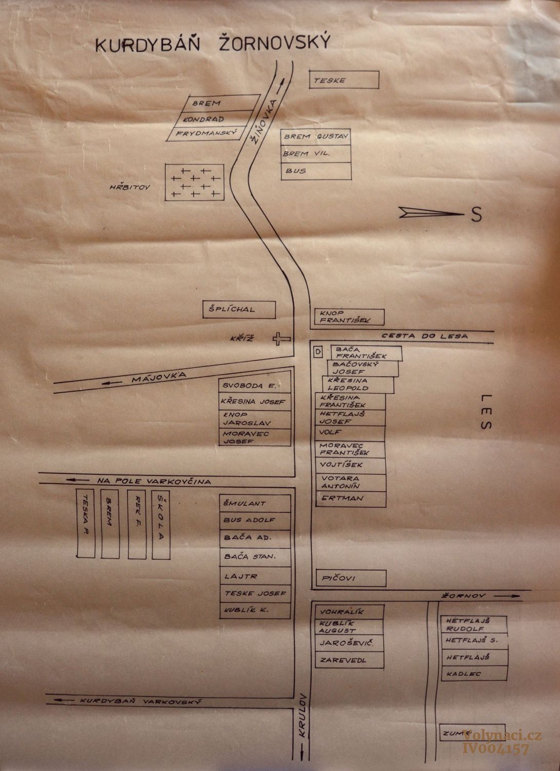 Schéma českých usedlostí obce Kurdybáň Žornovský (datum odhadem), Rok: 1940, Zdroj: archiv rodiny Šircových, Inventární číslo: IV003464