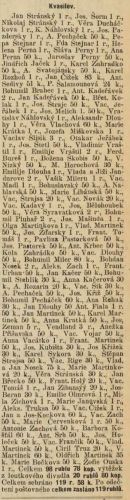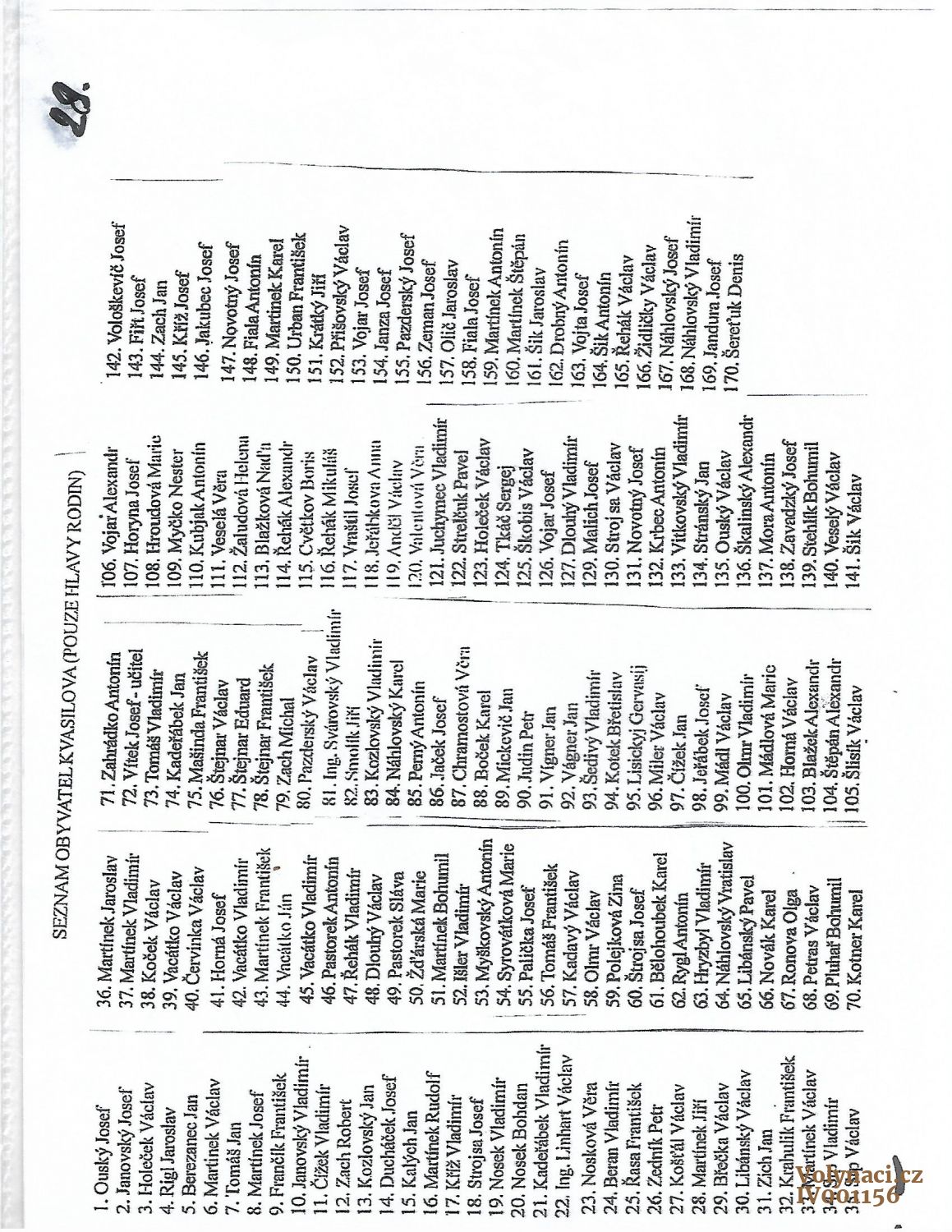 Legionáři 1. sv. válkyFiala Josef (* 19. 9. 1894)Křížek Antonín (1) (* 20. 5. 1898, † 12. 3. 1977) Nosek Vladimír, Jan (* 17. 2. 1886, † 6. 7. 1953) Příslušníci čs. jednotek za 2. sv. válkyHrdý Antonín, Jan (1) (* 20. 2. 1898, † 1. 11. 1975)Košťál Václav, Václav (1) (* 3. 4. 1913, † 21. 7. 1968) Kříž Josef (* 20. 7. 1910) Skopový Viktor (* 19. 3. 1901) Štrojsa Václav, Josef (4) (* 8. 7. 1907, † 16. 4. 1981) Šutt Jiří, Jakub (3) (* 11. 8. 1927, † 28. 4. 1998) Vágner Mikuláš, Felix (2) (* 2. 2. 1902, † 26. 3. 1951) Ostatní? Anastázie, Benešová (1) (* 1906)? Anna, Dlouhá (* 21. 6. 1884) ? Anna, Fialová (* 13. 5. 1898) ? Anna, Hůrková (* 1913) ? Anna, Kutková (* 1888) ? Anna, Řeháková (1) (* 25. 7. 1895, † 24. 8. 1981) ? Antonie, Novotná (* 1873) ? Barbora, Olmerová (Olmrová) (* 1868) Beneš František, Josef (1) (* 30. 7. 1896, † 16. 2. 1968) Brdová Antonie, Novotná Břečka Jan (* 1865) Červenka Václav (* 27. 5. 1879) Čížek Jan, Václav (* 1897) Čížková Ludmila, Jan (* 1934) Čížková Marie, Václav, Čížková (1) (* 1901) Dlouhá Anna, Náhlovská (* 28. 2. 1908) Dlouhý Alexandr (* 27. 8. 1879) ? Emilie, Kotková (* 21. 11. 1894, † 13. 12. 1977) ? Emilie, Pastorková (* 22. 4. 1883, † 20. 3. 1971) ? Emilie, Vojarová (* 24. 9. 1886) Fiala Antonín, Josef (5) (* 1. 1. 1869, † 1921) Frančík Josef, Václav (* 1884) Frančík Václav, Václav (* 1881) ? Františka, Hrdá (1) (* 16. 4. 1908, † 3. 3. 1992) ? Helena, Josef, Olmrová (Olmerová) (* 1908) ? Helena, Mašindová (* 9. 3. 1924) Hloušková Emílie, Vojarová (1) (* 19. 7. 1906, † 5. 7. 1992) Horák Antonín, Jan (* 10. 6. 1863) Hubálková Anna, Pecháčková Hůrka Alexandr, Jan (* 1912) Hůrková Kateřina, Beranová (* 25. 9. 1916, † 5. 2. 1985) Chramostová Marie, Šereťuková (* 5. 8. 1875) Jaček Jan, Vincent (* 1894) Jandurová Marie, Kovandová (* 17. 4. 1872) Janza Václav (* 11. 7. 1889, † 22. 7. 1968) Janzová Anna, Tesařová Jasanová Marie, Josef, Frančíková (1) (* 1886, † 12. 5. 1979) ? Julie, Skopová (* 3. 4. 1897) ? Julie, Židlická (* 22. 2. 1895, † 9. 6. 1949) Kadavý Václav, Josef (* 1878) Kadeřábková Anna, Václav, Klichová (1) ? Kateřina, Maksová (* 30. 5. 1875, † 27. 1. 1955) Klich Alexandr, Vojtěch (1) († 1972) Klichová Marie, Vojtěch, Kadeřábková (1) (* 17. 3. 1886) Kondelíková Anna, Filip, Kodejšková (1) (* 9. 7. 1896, † 26. 3. 1949) Košťálová Marie, Kozlovská (1) (* 5. 10. 1880, † 16. 7. 1953) Kotek Břetislav (* 8. 5. 1884, † 1. 2. 1948) Kotová Anna, Mašindová (* 1. 5. 1886) Kozlovský Ivan Králová Olga, Vladimír, Vlachová (16) (* 1904, † 1956) Krásnoselský Fedor (* 17. 1. 1927) Krbec Antonín (1) (* 11. 2. 1918, † 9. 9. 2003) Kříž Vladimír (1) (* 17. 3. 1887) Křížová Marie, Vladimír, Masopustová (1) (* 1913) Kubíková Zdena, Dobroslav, Machková (1) (* 4. 1. 1941) Kutek Josef, Josef (* 1880) ? Libuše, Krbcová (* 28. 11. 1918, † 10. 1. 2004) Licinberg (Licinberk) Jan (1) (* 10. 4. 1865, † 5. 6. 1949) ? Marie, Červenková (* 19. 11. 1881) ? Marie, Dlouhá (1) (* 15. 11. 1906, † 13. 10. 1982) ? Marie, Janzová (* 1908) ? Marie, Křížová (* 1920) ? Marie, Melichová (1) (* 15. 6. 1908, † 3. 9. 1995) ? Marie, Nosková (* 22. 2. 1891, † 30. 9. 1972) ? Marie, Pastorková (1) (* 1. 3. 1925, † 14. 4. 2015) Martínek Antonín (* 13. 6. 1886, † 2. 2. 1955) Martínek Josef (* 21. 5. 1885) Martínek Karel (* 9. 5. 1875) Martínek Mikuláš Martínková Žofie, Křížová (1) (* 8. 6. 1891) Mašinda Antonín (* 13. 6. 1910) Melich Jaroslav, Josef (1) (* 24. 1. 1933, † 23. 8. 1988) Melich Josef, Josef (1) (* 20. 12. 1899, † 11. 11. 1983) Mikynová Alžběta, Josef, Fialová (8) (* 1879, † 1939) Munzar Ludvík, František (* 21. 1. 1885) Novák Alexandr, Václav (* 1938) Novák Antonín, Václav (* 1944) Novák Mikuláš, Václav (* 1936) Novák Václav (* 1889) Novotná Antonie, Šiková (1) (* 15. 2. 1911, † 7. 12. 1948) Novotný Jan (* 10. 10. 1872) ? Olga, Janzová (* 13. 3. 1889, † 27. 7. 1970) ? Olga, Maksová (* 15. 1. 1913) ? Olga, Štrojsová (1) (* 1896) ? Olga, Václav, Vojarová (2) (* 22. 1. 1910, † 7. 2. 2000) Olmer (Olmr) Václav (* 1861) Olmer (Olmr) Vladimír, Václav (* 1907) Olmrová (Olmerová) Jiřina, Josef (* 1936) Pastorek Boris, Antonín (* 1945) ? Pavlína, Vostřezová (* 1889) Pazderský Josef (1) (* 2. 5. 1867, † 1. 2. 1950) Pecháček Alois Pecháčková Helena, Pospíšilová (* 1933) Perná Helena, Antonín, Pšičkinová Perná Ludmila, Antonín, Vágnerová (1) (* 9. 10. 1910) Perná Olga, Štípková (* 10. 1. 1913) Perná Věra, Antonín, Kovaříková (* 18. 11. 1911) Perný Antonín, Josef (7) (* 17. 7. 1873, † 21. 5. 1934) Perný Václav, Antonín (1) (* 20. 8. 1902) Poláková Božena, Jan, Čížková (1) (* 11. 5. 1867) Prokopjuk Vladimír (* 1924) Rigl Antonín (1) (* 3. 5. 1893, † 20. 8. 1968) Rykl Josef, František (* 1866) Skalská Marie, Karel, Zahrádková (* 23. 8. 1892, † 7. 2. 1979) Srbová Marie, Martínková (* 20. 9. 1890, † 22. 11. 1958) Stránská Alžběta, Antonín, Svárovská (4) (* 1862) Syřišťová Barbora, Kocková (* 1856) Šedivý Anton, Anton (1) (* 1. 9. 1890, † 27. 5. 1975) Šereťuk Dionis, Štěpán (* 1887) Škrancová Marie, Josef, Sahulková (* 5. 3. 1884) Šrajbrová Marie, Bohumil, Kubíková (3) (* 1922) Štípková Ludmila, Mikuláš, Štěchová (1) (* 20. 7. 1940) Šubrt Antonín, Václav (* 19. 2. 1904) Šubrt Jiří, Antonín (* 26. 4. 1936) Šubrt Miroslav, Antonín (* 17. 11. 1938) Tesař Jan Tomášová Věra, Josef, Benešová (Martínková) (* 2. 10. 1913) Vaňhabrová Libuše, Vladimír, Tomášová (* 13. 2. 1919, † 2003) Vaňhalová Olga, Šubrtová (* 10. 5. 1880) ? Věra, Bláhová (* 14. 6. 1907) ? Věra, Svárovská (* 1900) Vlachová Jiřina, Vladimír (5) (* 1931) Vojar Václav (2) (* 13. 9. 1936, † 30. 3. 2001) Voja