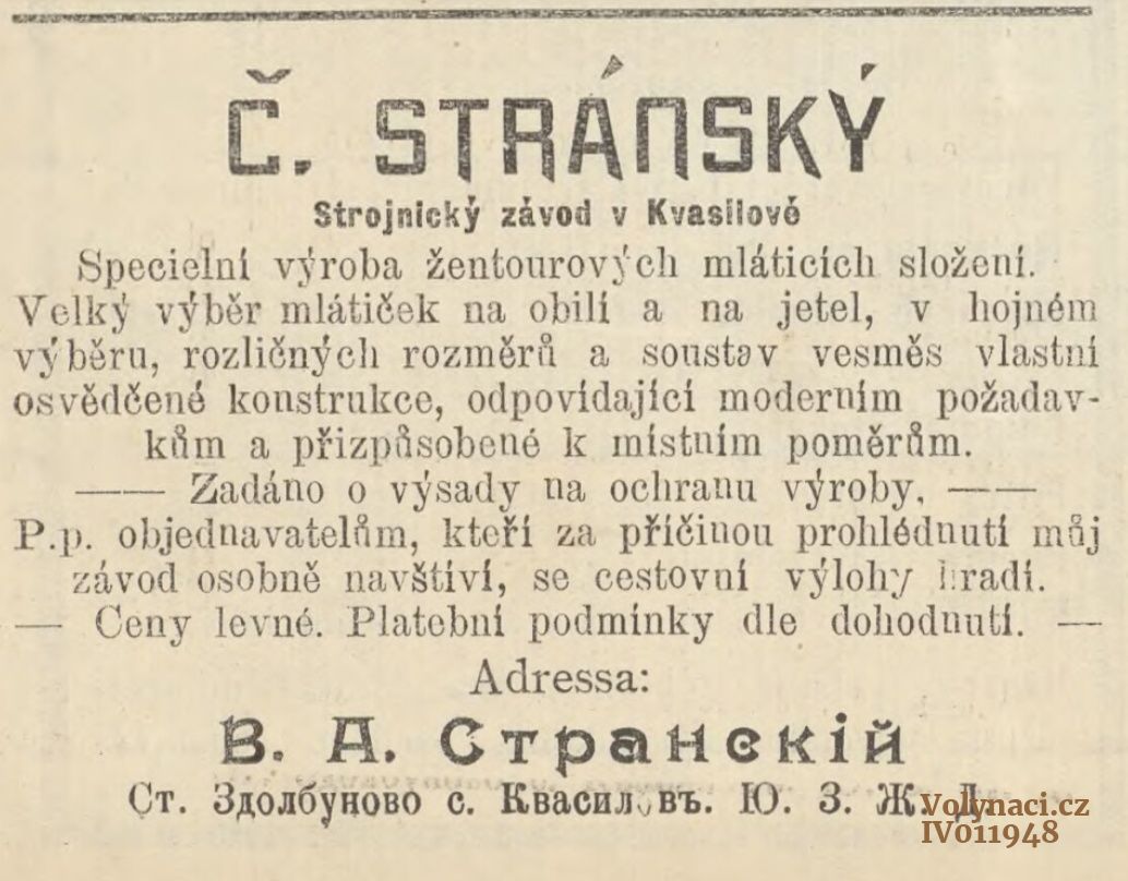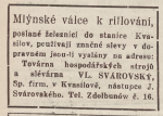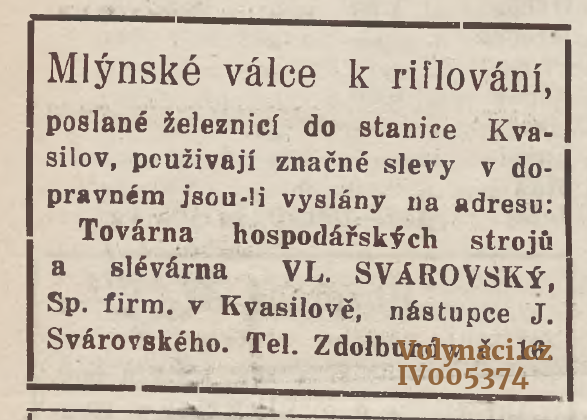 Reklama Továrny hospodářských strojů a slévárny Vl.Svárovský z Hlasu Volyně - 16.3.1936