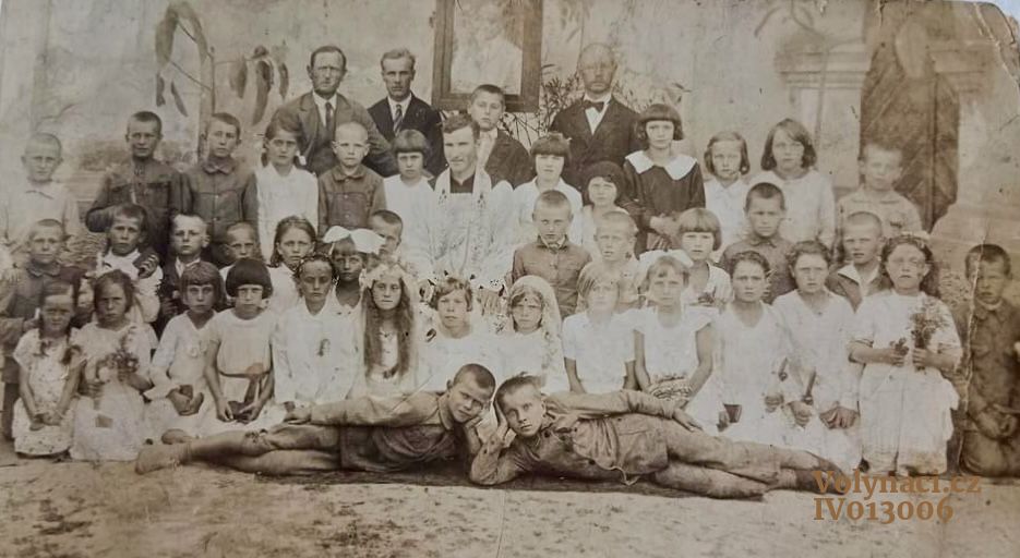 Polští učitelé z okolí při setkání v Ledochovce na Volyni. Uprostřed dole malá Lydie Beštová - Půrová (datum odhadem)