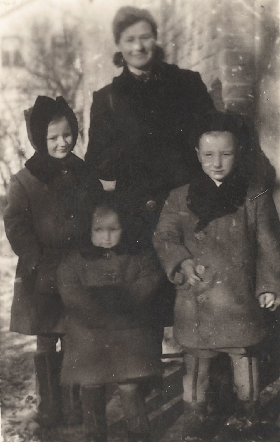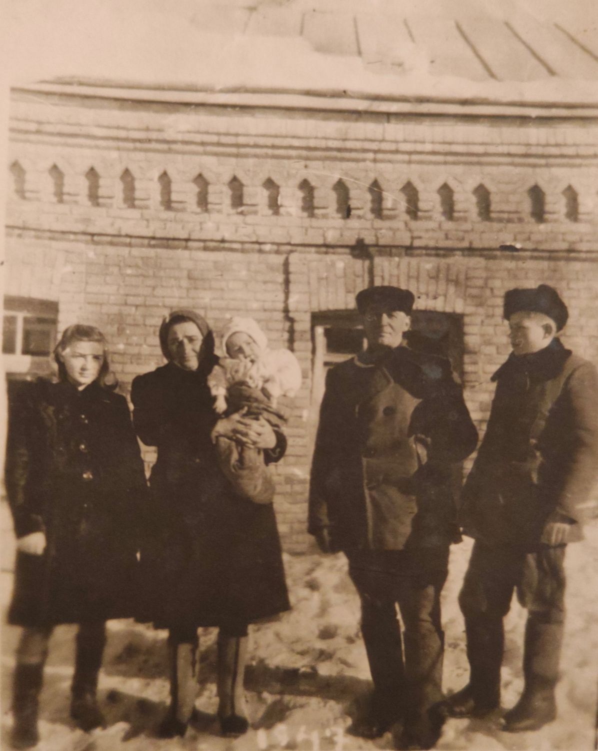 Rodina Václava Rébla před svým domem v Lipjanech, počátek roku 1947 před odjezdem do Československa, zleva Réblová Emilie, Václav, Hrubá (*1. 1. 1933 Lipjany) Krupková Marie, František, Réblová , v náručí Rébl Vladimír, Václav (* 24. 5. 1946 Lipjany) , Rébl Václav, Václav , Rébl Mstislav, Václav