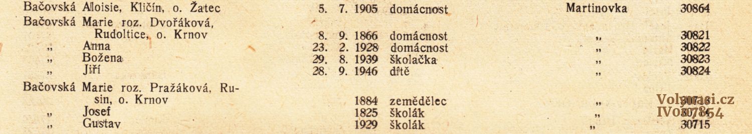 Legionáři 1. sv. válkyJanko Josef, Jan (6) (* 28. 3. 1897, † 17. 12. 1985)LIPINSKÝ Lukian Příslušníci čs. jednotek za 2. sv. válkyBača Václav (1) (* 2. 7. 1909)Bačovský Gustav, František (6) (* 10. 1. 1901, † 23. 7. 1944) Bačovský Miloslav (* 13. 3. 1913) Bačovský Miloslav, František (1) (* 25. 5. 1923) Bačovský Miroslav (* 20. 2. 1913) Bačovský Stanislav (7) (* 15. 10. 1924) Bačovský Václav, Josef (2) (* 20. 11. 1920) Bačovský Vladimír, František (* 1. 12. 1925) Bačovský Vladislav (* 10. 9. 1920) Belický Štěpan (* 23. 12. 1921) Cígl Josef, Emanuel (3) (* 5. 5. 1911, † 10. 5. 1986) Dvořák František (* 28. 11. 1906) Dvořák Jaroslav, František (* 10. 11. 1910) Dvořák Karel (* 11. 5. 1898) Dvořák Václav (* 19. 3. 1905) Havlíček Adolf (* 19. 3. 1905) Havlíček František (* 16. 8. 1899) Havlíček Jaroslav (1) (* 18. 7. 1910) Havlíček Václav, František (* 11. 5. 1925) Herblich Josef, Antonín (2) (* 27. 1. 1911) Herblich Stanislav (2) (* 12. 11. 1913) Hnídek Jaroslav, Václav (2) (* 24. 12. 1924, † 31. 3. 1945) Jahoda Jaroslav, František (* 5. 4. 1911, † 10. 9. 1944) Janko Jaroslav (* 19. 10. 1899) Janko Stanislav, Josef (* 20. 12. 1923) Janko Václav (* 14. 9. 1914) Janko Vladislav (* 3. 9. 1911) Kovář Josef, František (* 29. 6. 1915) Krčma Josef (* 12. 6. 1898) Krčma Josef (1) (* 25. 5. 1919, † 9. -23. 9. 1944) Lajnweber Josef (* 20. 5. 1926) Lipinský Václav (* 1. 9. 1924) Lipínský Václav, Lukáš (* 21. 11. 1924) Mangold ( Mangolt ) Josef (* 10. 8. 1912) Mangold Václav, František (* 26. 7. 1913) Merunka Vladimír (* 15. 3. 1915) Moravec Josef (* 20. 11. 1913) Oberajtr František, František (* 23. 8. 1913) Oberajtr Vladislav, Josef (* 1. 8. 1926) Roušal Josef (1) (* 5. 5. 1919, † 9. 2. 1997) Ševčík Adolf (* 15. 8. 1900) Šustr Miroslav (* 14. 12. 1907) Vendolský Jan (5) (* 6. 5. 1926) Vendolský Josef, Josef (7) (* 6. 1. 1912) Vendolský Stanislav (14) (* 1. 4. 1923) Vendolský Václav, Josef (6) (* 3. 3. 1915) Vendolský Václav, Rudolf (6) (* 6. 8. 1923, † 25. 6. 2004) Vojtešek František, Ant. (* 2. 6. 1902) Vojtíšek František (* 2. 8. 1902, † 14. 9. 1974) Zemba Josef, Jan (* 1. 2. 1905) OstatníBača Stanislav, Václav (5) (* 29. 6. 1912, † 22. 3. 1997)Bačevská Helena, Boleslav (1) (* 30. 7. 1943) Bačevská Ludmila, Boleslav (1) (* 1. 7. 1938) Bačevská Marie, Miloslav (1) (* 22. 7. 1938) Báčová Anna, Václav, Havlíčková (2) (* 25. 11. 1903) Báčová Cecílie, Vendolská (* 31. 12. 9999) Bačovská Anna, Josef, Truhlářová (2) (* 23. 2. 1928) Bačovská Anna, Leopold, Pavlínová (2) (* 7. 10. 1913, † 4. 8. 1996) Bačovská Anna, Vendolská (1) (* 25. 5. 1922, † 16. 7. 1999) Bačovská Božena, Josef (2) (* 29. 8. 1939) Bačovská Božena, Leopold, Bačová (4) (* 8. 5. 1918, † 30. 10. 1976) Bačovská Božena, Vohralíková (* 2. 4. 1892) Bačovská Helena, Boleslav, Tomešová (* 20. 7. 1943) Bačovská Josefa, Leopold (1) (* 15. 10. 1929) Bačovská Josefa, Leopold, Černá (3) (* 15. 8. 1927, † 20. 2. 1970) Bačovská Libuše, Miroslav (1) (* 11. 2. 1931) Bačovská Ludmila (1) (* 1. 1. 1890) Bačovská Ludmila, Boleslav, Nociárová (* 30. 6. 1938, † 9. 5. 2020) Bačovská Ludmila, Leopold (1) (* 25. 6. 1933) Bačovská Ludmila, Leopold, Bačovská (2) (* 30. 3. 1932, † 29. 1. 2004) Bačovská Marie, Leopold, Herblichová (4) (* 6. 1. 1921, † 8. 5. 1975) Bačovský Adolf, František (3) (* 1891) Bačovský Boleslav, Vladimír (5) (* 23. 3. 1915, † 20. 5. 1974) Bačovský Jan, Leopold (10) (* 28. 12. 1919, † 2. 5. 1996) Bačovský Jaroslav, Vladimír (3) (* 27. 12. 1919, † 11. 6. 2002) Bačovský Jiří (1) (* 28. 9. 1946) Bačovský Josef (1) (* 25. 12. 1880, † 4. 8. 1964) Bačovský Josef, František (2) (* 1882, † 3. 5. 1943) Bačovský Leopold (1) (* 11. 11. 1882, † 31. 12. 1948) Bačovský Leopold, František (17) (* 5. 5. 1889, † 31. 12. 1948) Bačovský Stanislav (2) (* 19. 6. 1925) Bačovský Stanislav, Jan (* 28. 2. 1946) Bačovský Stanislav, Leopold (1) (* 18. 5. 1925, † 25. 1. 1970) Bačovský Vladimír (4) (* 20. 8. 1895, † 19. 9. 1973) Bačovský Vladimír, Leopold (2) (* 20. 2. 1917, † 29. 12. 1979) Bakovská Marie, Lérová (* 15. 7. 1915) Černý Josef (1) (* 29. 9. 1922, † 26. 10. 2010) Dolečková Antonie, Stryjová (5) (* 27. 4. 1904, † 20. 3. 1985) Dvořák Josef, František Dvořák Rudolf, František Dvořáková Božena, Vendolská (1) (* 1892) Dvořáková Cecilie, Vendolská (1) (* 20. 7. 1879, † 20. 7. 1972) Dvořáková Emílie, Eflerová (* 28. 11. 1916) Dvořáková Kristina, František, Košátková (* 1907) Dvořáková Marie, Žitná (* 19. 12. 1909) Dvořáková Rosálie, František, Dvořáková (* 20. 6. 1883) Havlíček Miloslav (1) (* 31. 12. 1934) Havlíčková Anna, Stanislav, Herblichová (6) (* 4. 10. 1907) Havlíčková Libuše (1) (* 31. 12. 1936) Havlíčková Marie, Josef (* 6. 4. 1931) Herblich Arnošt (4) (* 8. 2. 1901) Herblich Stanislav (1) (* 31. 12. 1909) Herblichová Anna (1) (* 19. 5. 1931) Hnídková Libuše, Václav, Petráková (* 20. 3. 1922, † 28. 4. 2012) Jahoda František, Vincent (* 1882, † 1915) Jahoda Josef, Josef (* 15. 6. 1897, † 28. 9. 1938) Jahoda Miloslav, František (* 2. 2. 1911, † 28. 8. 1989) Jahoda Vincent, Vincent (* 1892, † 1966) Jahodová Božena, František, Rejchrtová (* 21. 4. 1915, † 25. 2. 2006) Jahodová Josefa, František, Slavíková (* 2. 3. 1913, † 7. 7. 1984) Jahodová Libuše, Vincent (* 14. 1. 1924, † 4. 5. 2010) Janko Petr, ? (* 29. 6. 1897) Janková Jaroslava, Josef, Hofmanová (3) (* 14. 11. 1926, † 14. 5. 2012) Janková Kristina, Arnošt, Štechová (* 8. 11. 1931, † 3. 9. 2024) Janková Libuše, Josef, Šreková (1) (* 1. 1. 1922, † 1999) Kabát Emanuel, Jan (* 20. 7. 1931) Kabát František, Jan (1) (* 1894) Kabát Jan, Jan (* 21. 2. 1905) Kabát Jaroslav, Jan (* 14. 4. 1913) Kabát Stanislav, Jan (6) (* 31. 12. 190