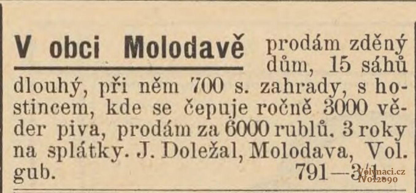 Hostinec v obci Moldava prodával v r.1913 p. J.Doležal