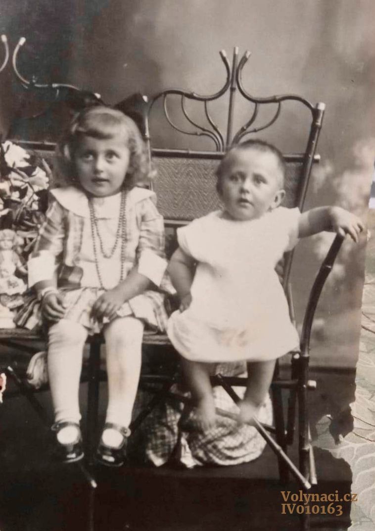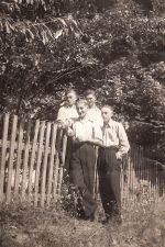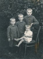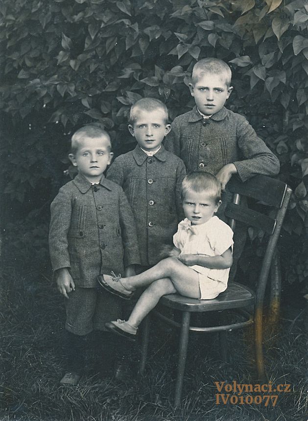 Rok 1947 - sourozenci Konáškovi po přesídlení, zleva Josef *1924, Bohumil *1930, Rostislav *1932, sedící Marie *1927
