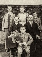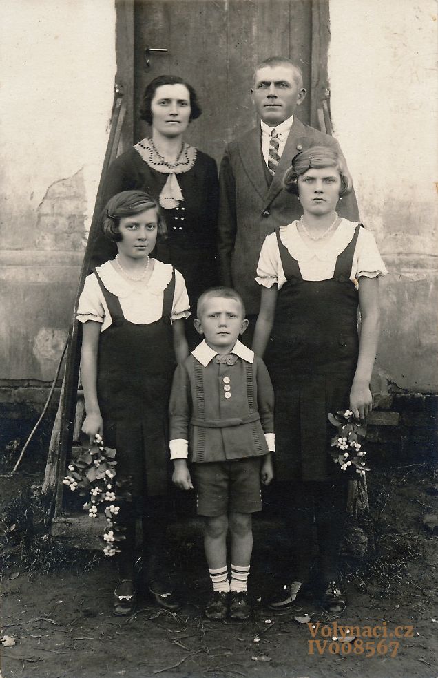 7.6.1944, Moskovčina: shora Josef, Marie, Bohumil; sedící rodiče Marie a Jaroslav, vpředu Rostislav