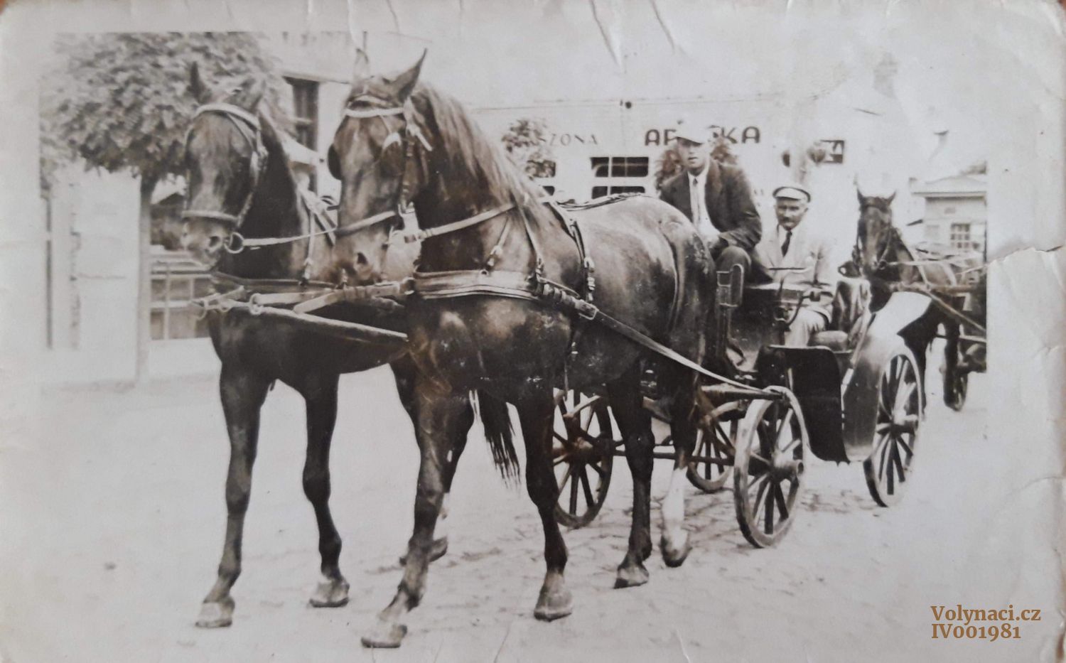 Chlév pro koně a skot - vzadu je sušárna chmele Ve světlých šatech je matka Jiřího Libuše, nar. Novostavce. S koňmi je otec Jiřího Josef, nar. Noviny České.