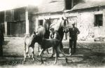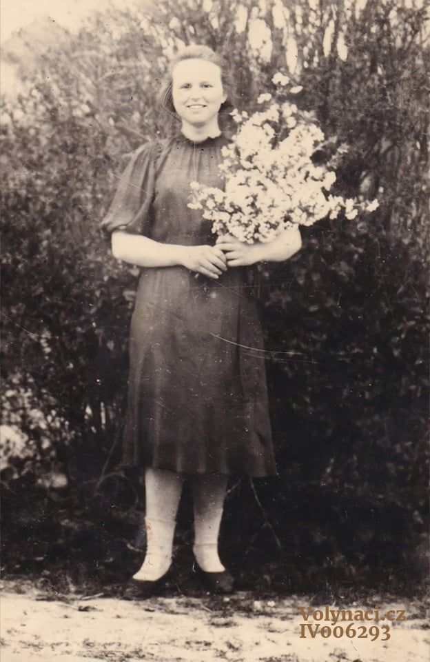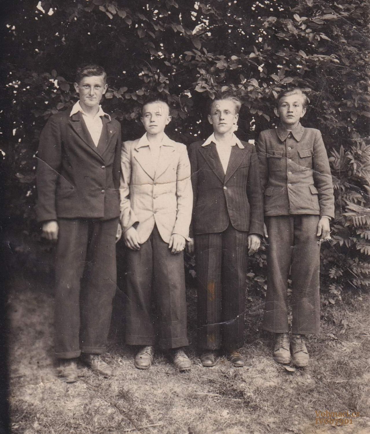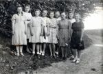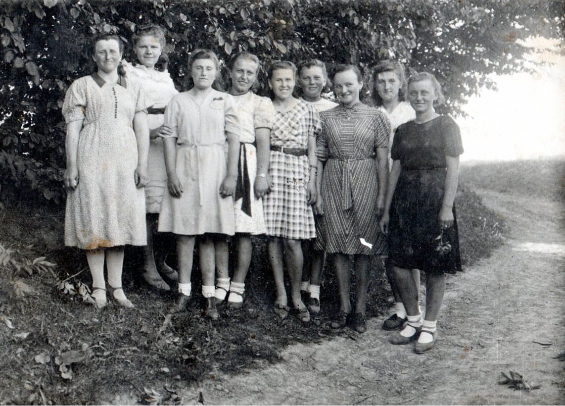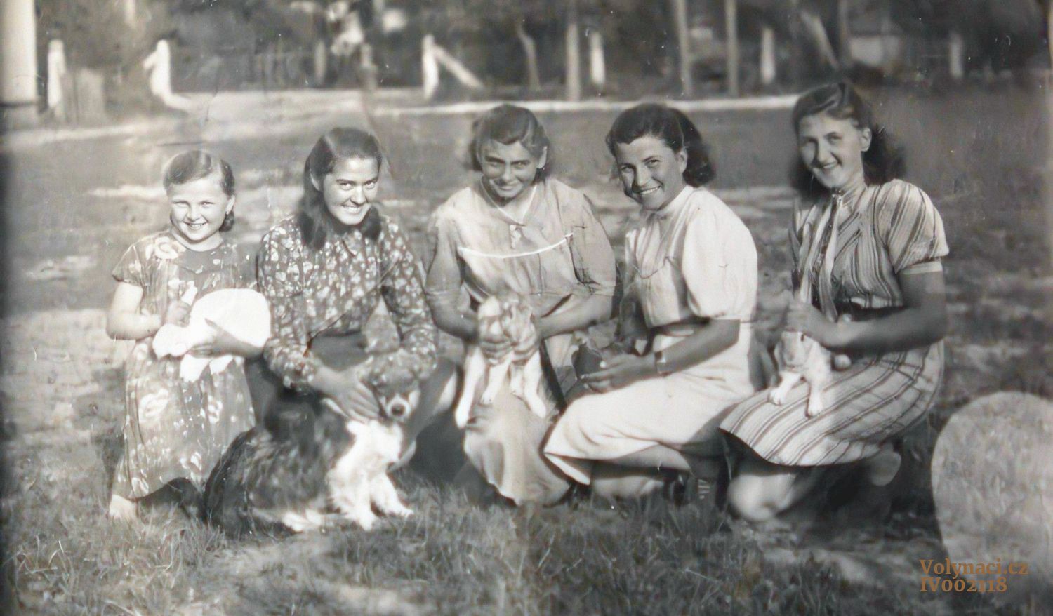 Bojarka, foceno před domem Jaroslava Vostrého po válce, před odjezdem do Čech zleva Marie Vostrá, Marika Sakonová, Milena Valentová, paní učitelka a úplně vpravo další Marie Vostrá