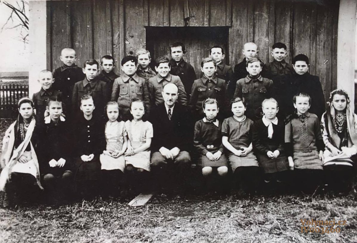 jednotřídka ze Semidub - s učitelem Vladimírem Fickem, horní řada čtvrtý zleva Václav Nudčenko, v druhé řadě třetí zleva je Anna Jansová - cca rok 1939 - 1940