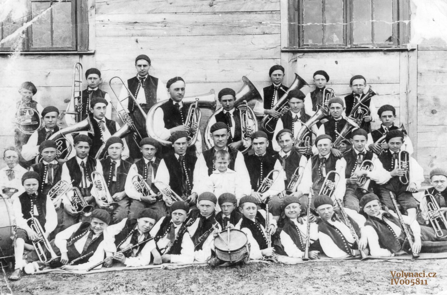 V Kupičově 1936, Židlického kapela, Senkevičovka. Bubínek dole uprostřed Sitař, nad kapelníkem Josef Robl, zprava 2.klarinet Josef Hlaváček, zpráva 1.trubka Václav Švajgr