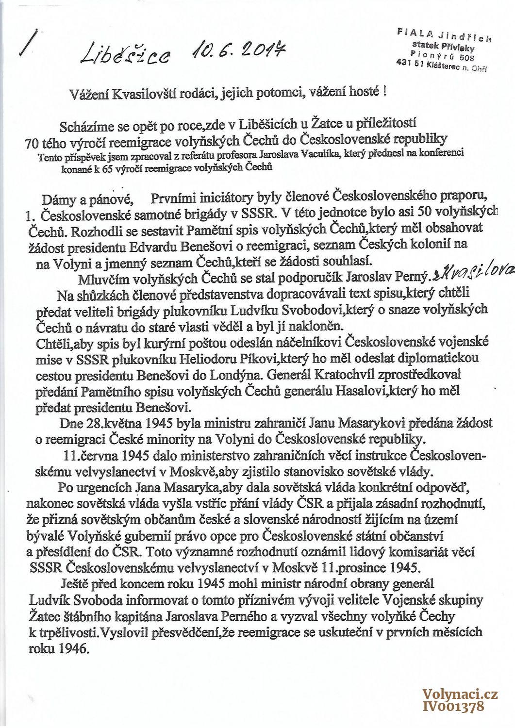 3. setkání 2017-PROJEV J.FIALY NA TŘETÍM SETKÁNÍ KVASILOVÁK 10.6.2017