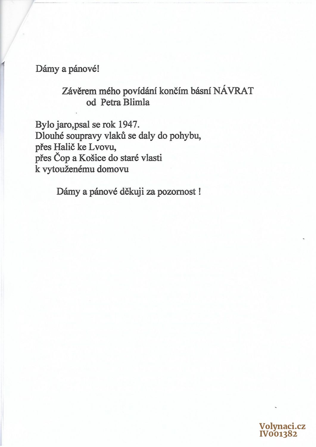 1986-PROJEV PANA MIKULÁŠE ŠEREŤUKA NA PRVNÍM SETKÁNÍ KVASILOVÁŮ V LIBĚŠICÍCH UŽATCE