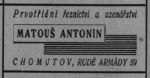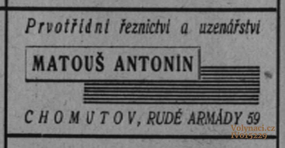 reklama v časopise Věrná stráž na řeznictví a uzenářství Antonína Matouše v Chomutově