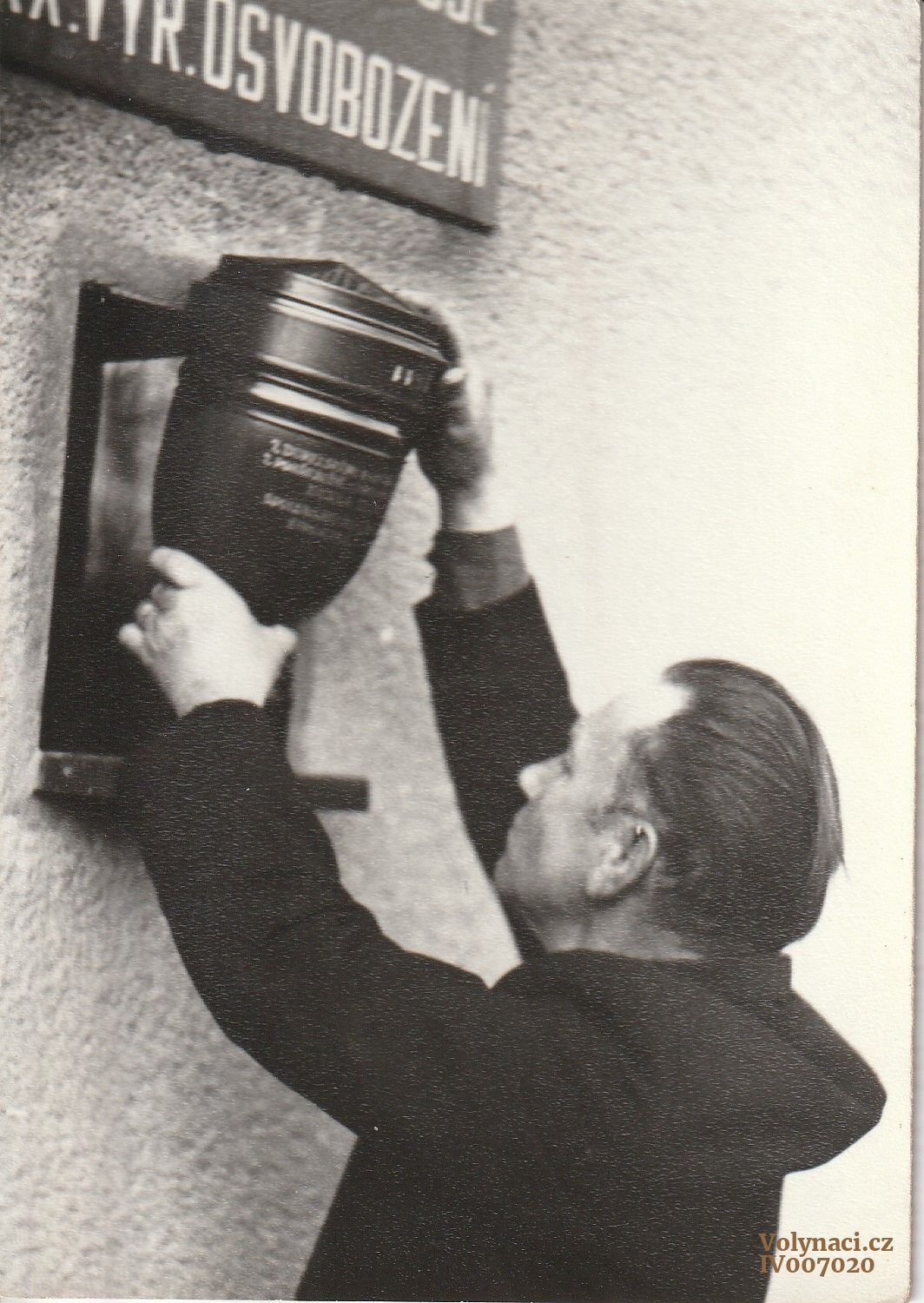 Bohumil Cupal ukládá urnu k pamětní desce - květen 1965 Strojetice