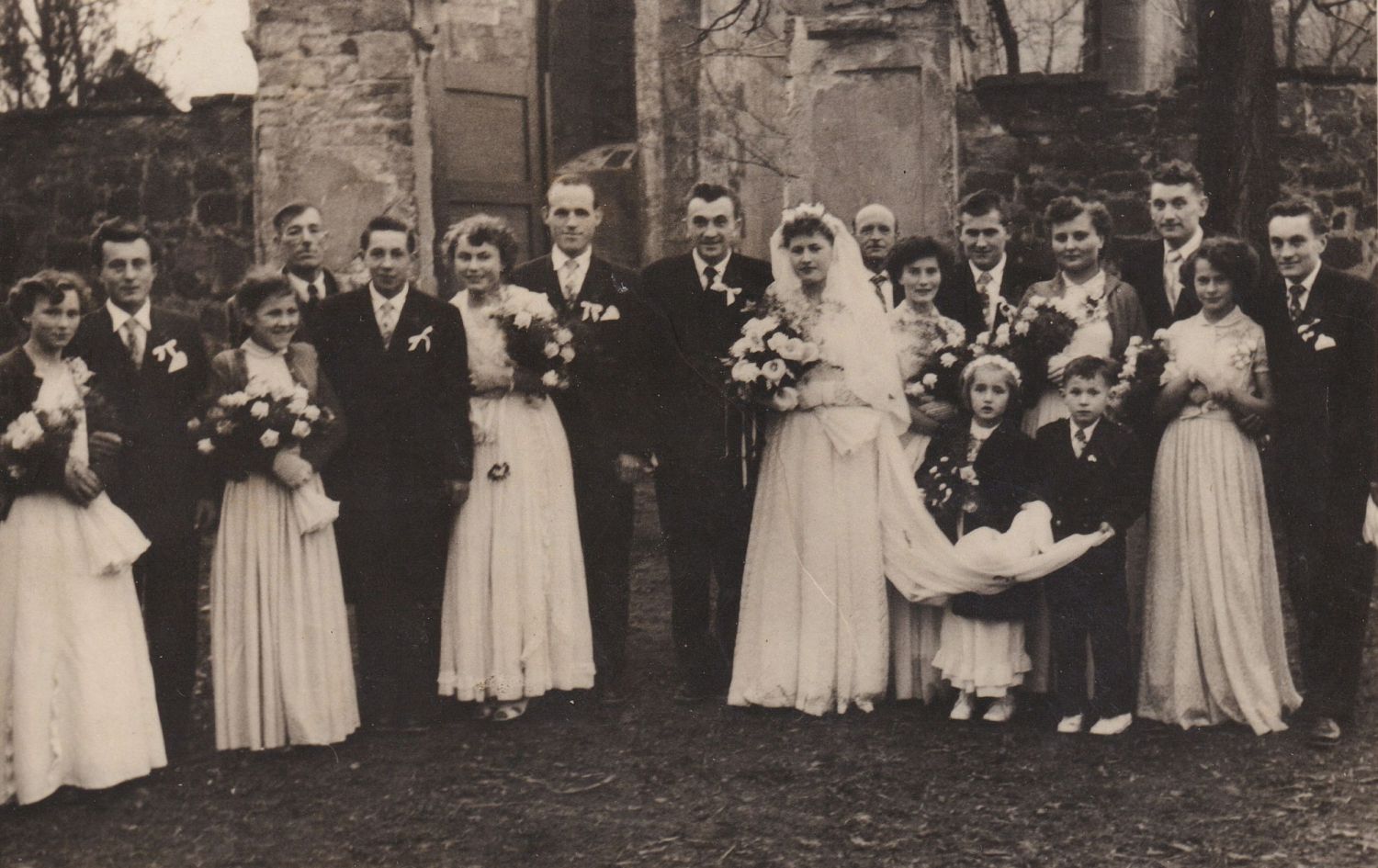 Svatba Josefa Vostrého a Marie Levické - obřad proběhl v katolickém kostele v Lenešicích a oslava u Levických v Břvanech, vedle nevěsty stojí její bratr Josef