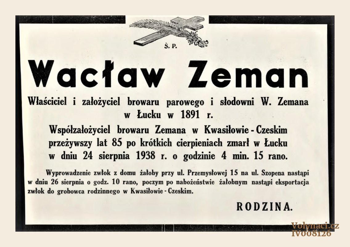 Nekrolog majitele a zakladatele parostrojního pivovaru a sladovny v Lucku Václava Zemana.