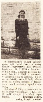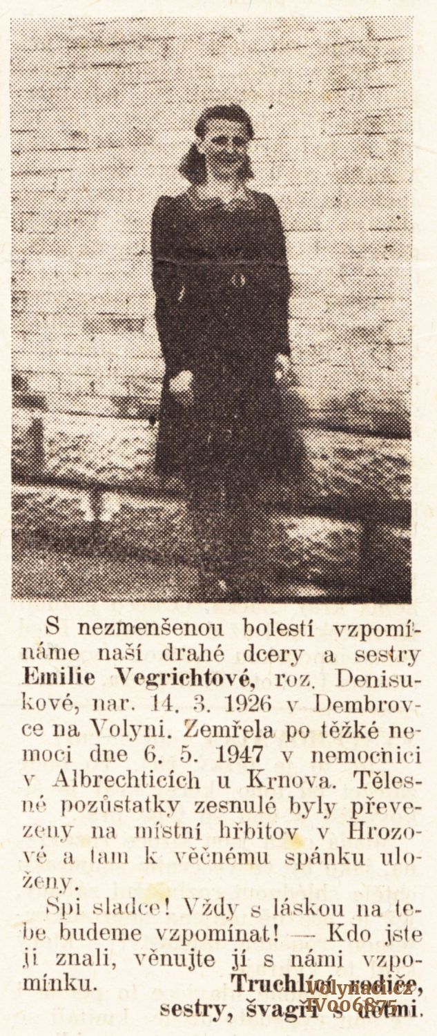 Nekrolog Emilie Vegrichtové roz.Denisukové z Dembrovky