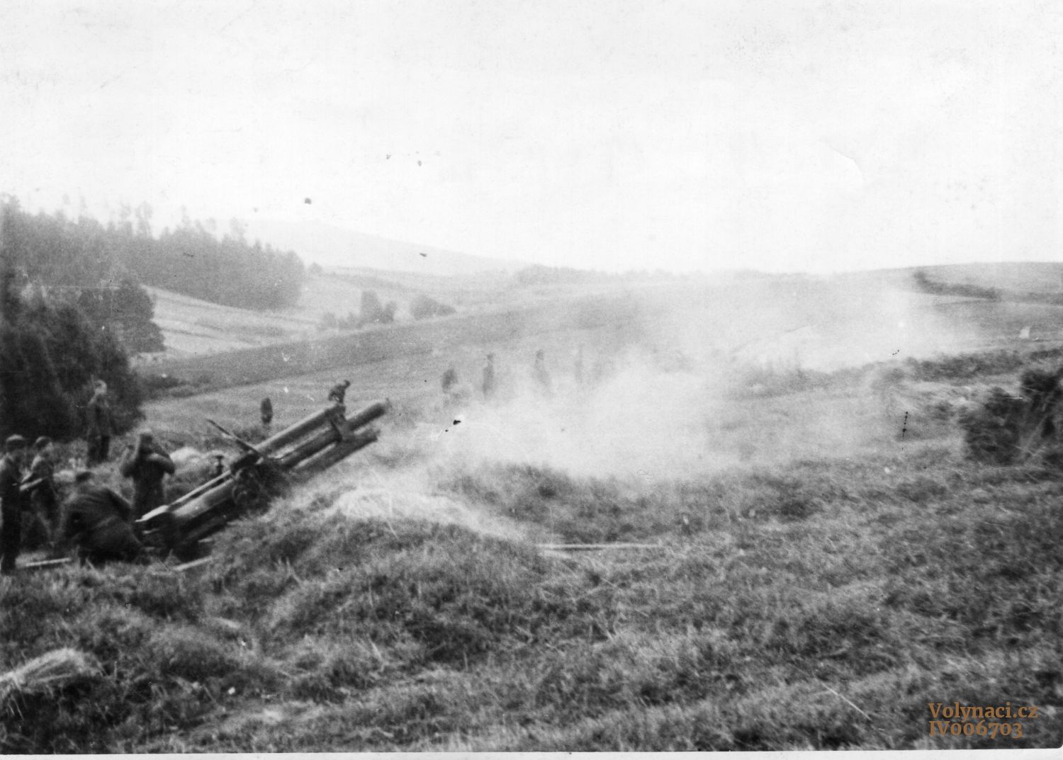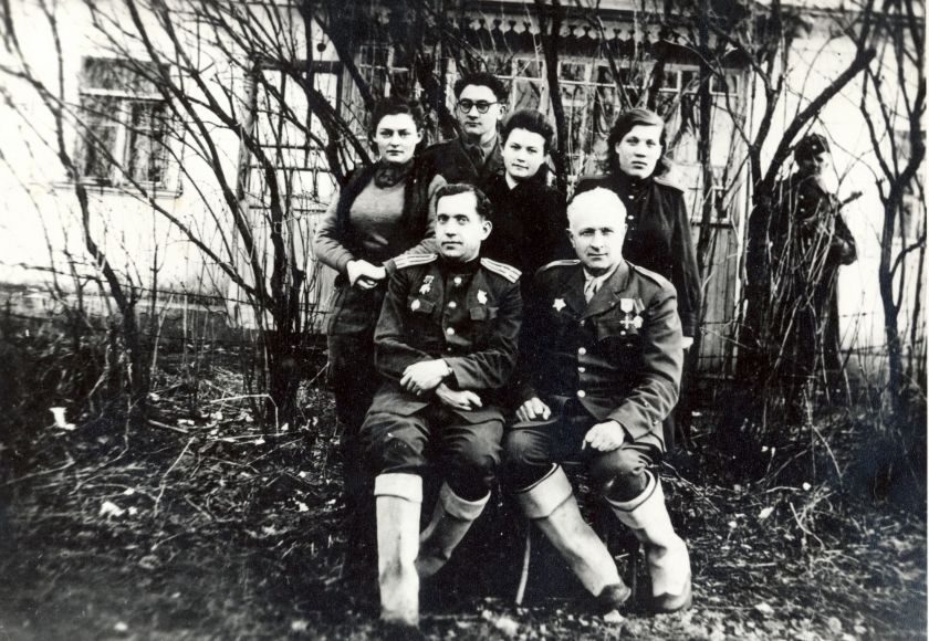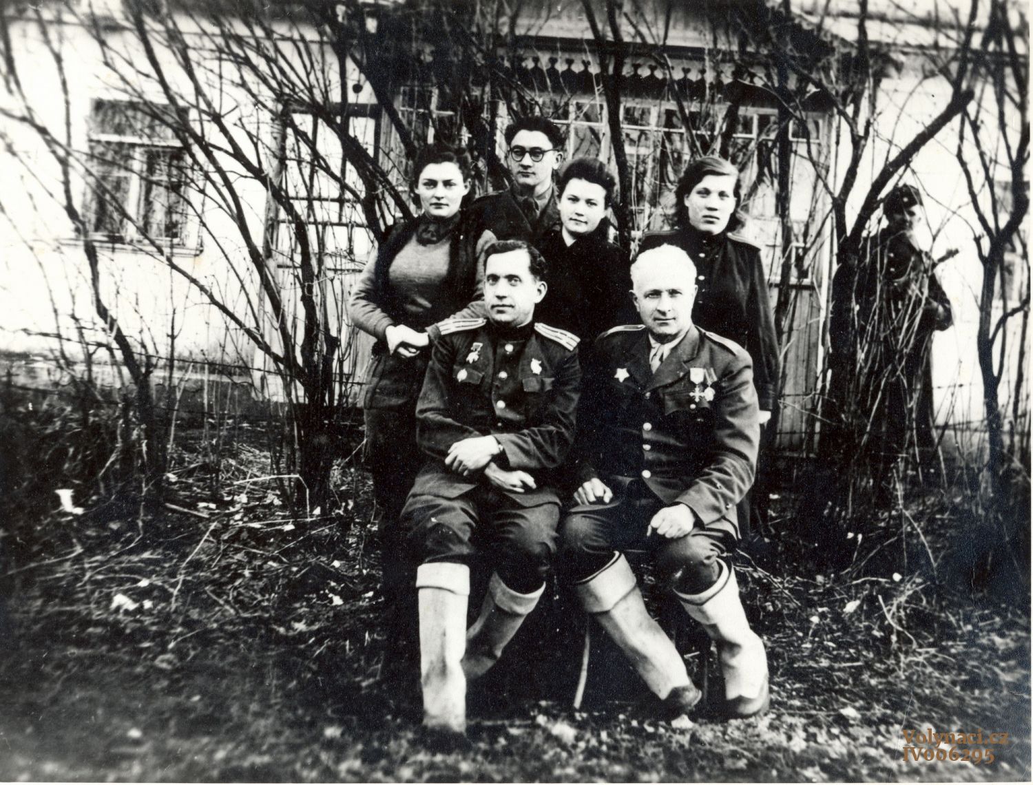 Na Volyni po jejím osvobození. Stojící zleva:M. Pišlová, Pánek, M. Pánková, sovětská vojínka. Sedící: sovětský styčný důstojník, plk. Svoboda