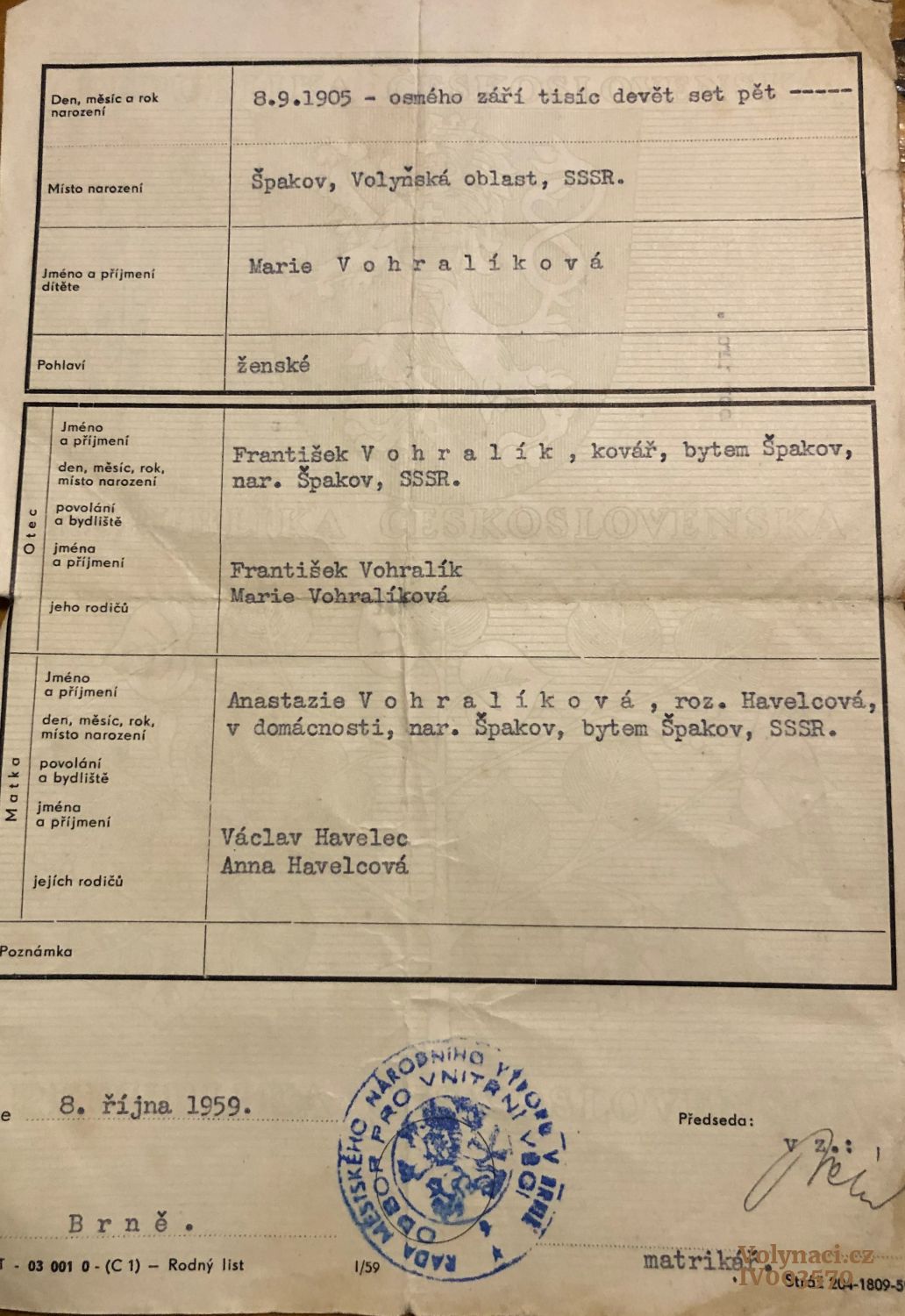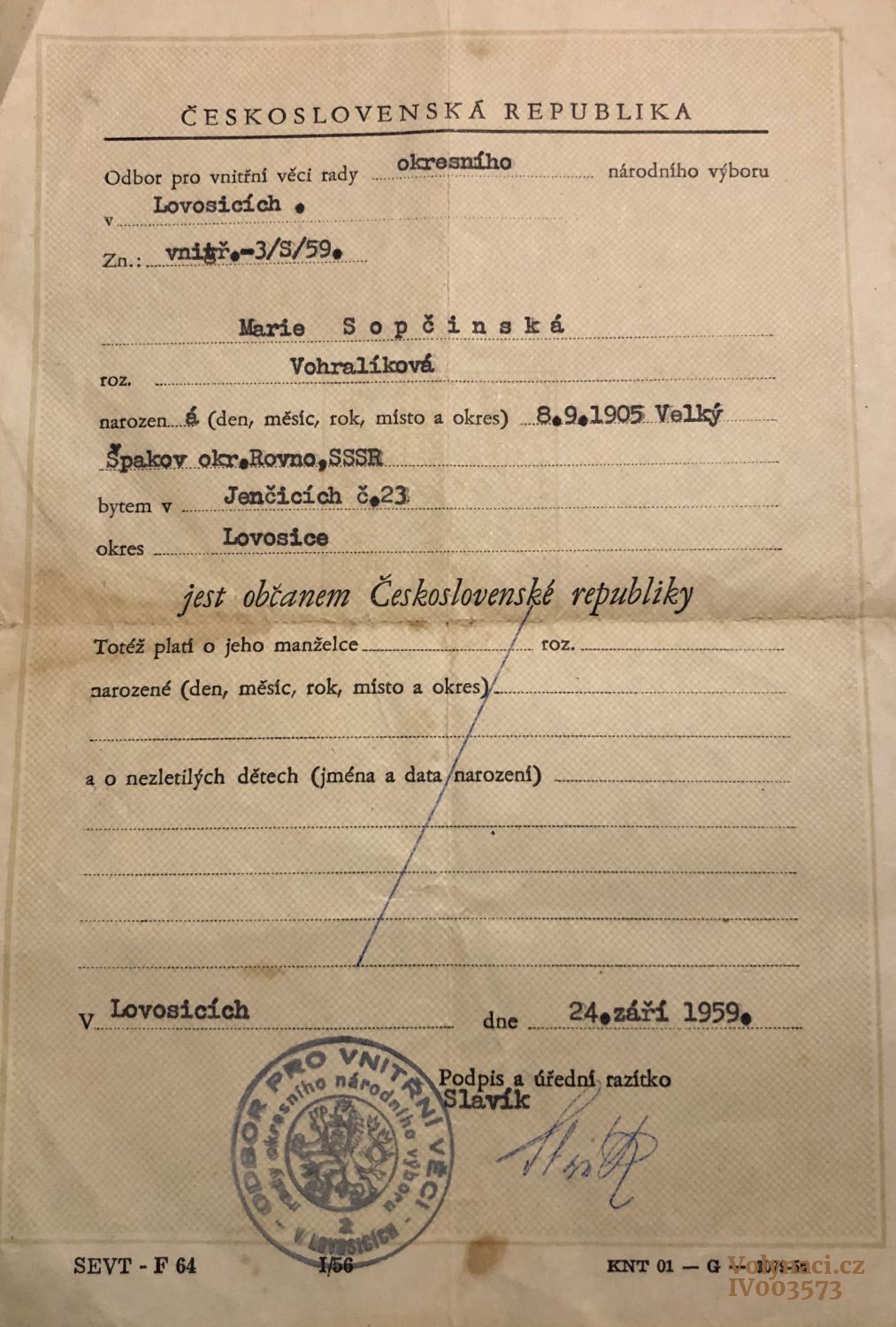 Manžel (Polák) Štefan Sopčinský byl zabit skupinou Banderovců na Volyni.