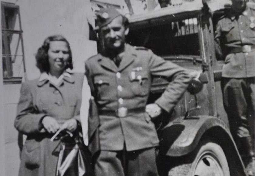Fedor Procházka s Vlad. Schovánkem s neznámou paní po skončení války v Praze