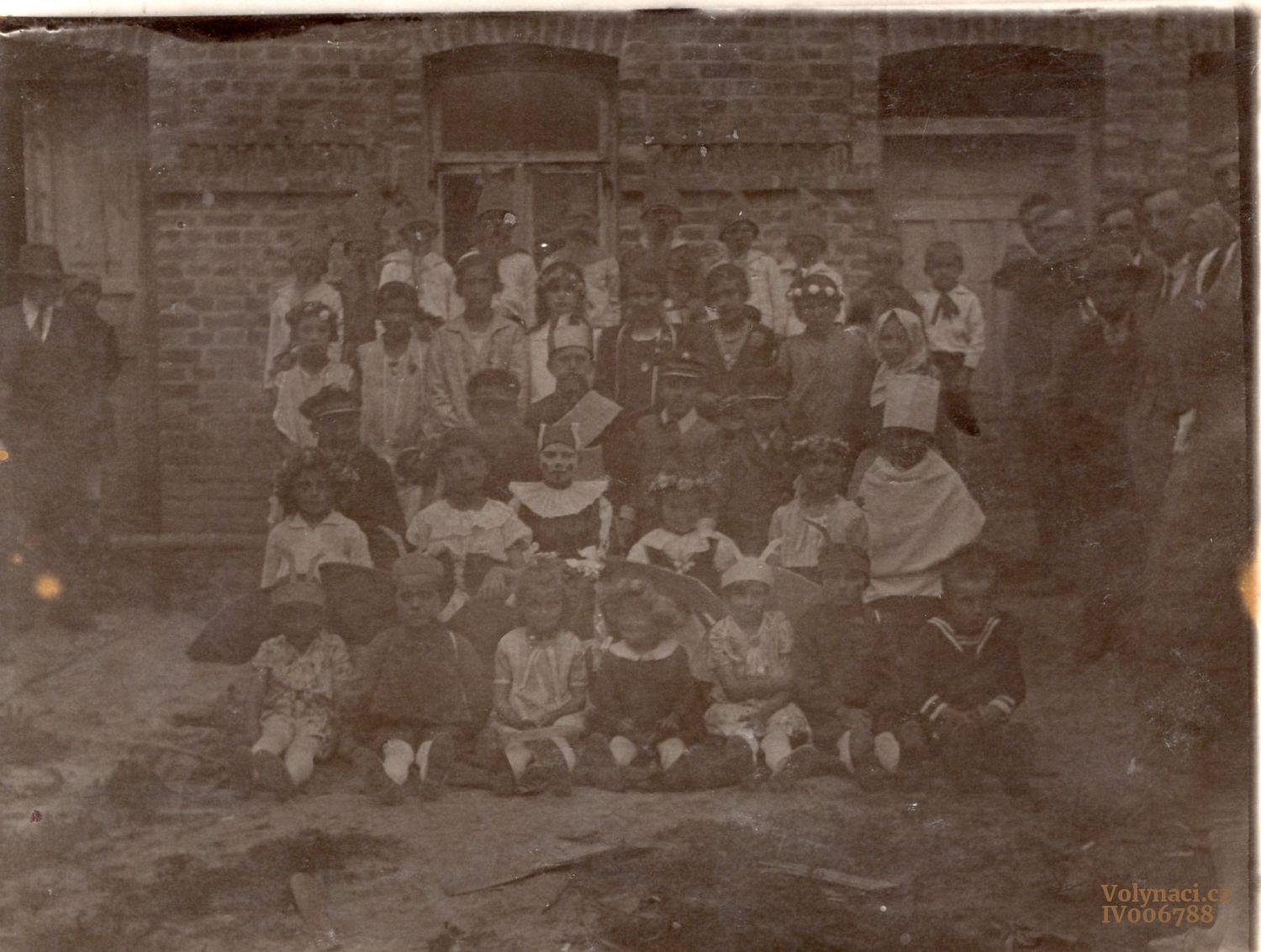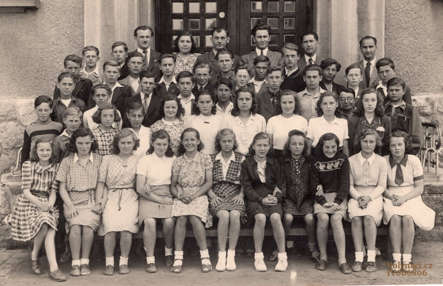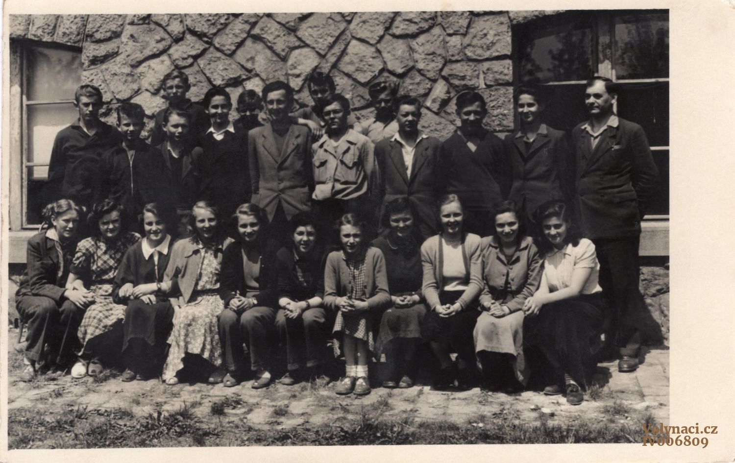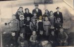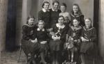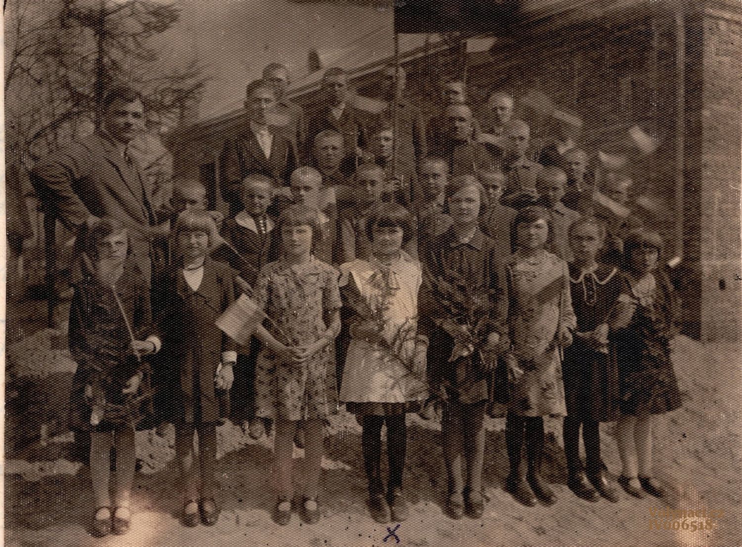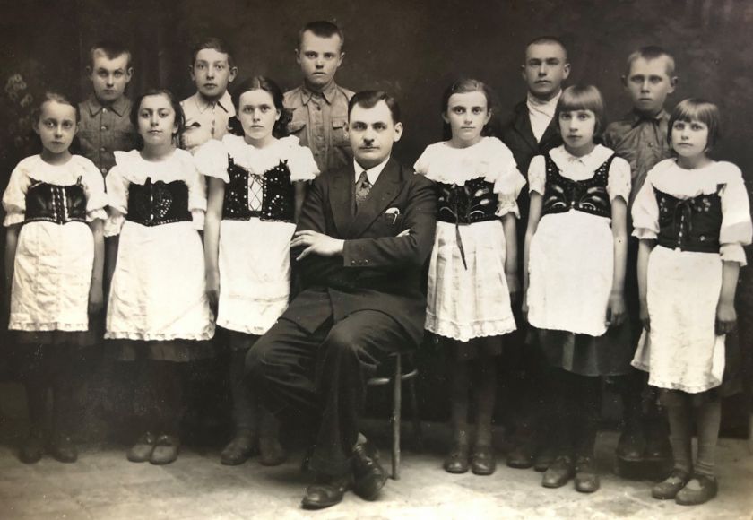 Učitel Jiří Rébl s žactvem - rok odhadem, Rok: 1938, Zdroj: Rodinný archiv Petry Pilátové, Inventární číslo: IV004677