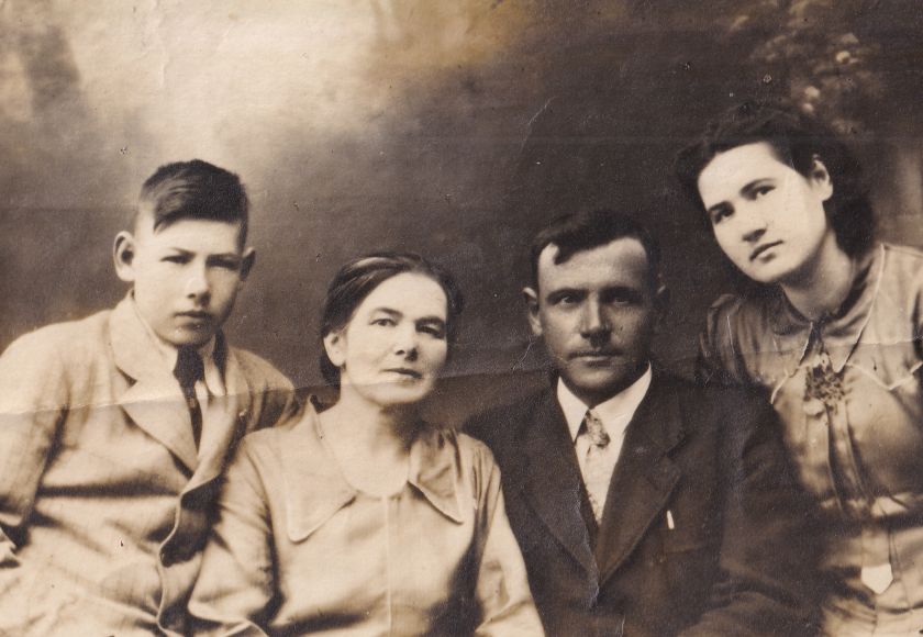 Rodina Švihlíková, odjezd na Volyň ke Žďárským, rok 1946, zleva Evžen Švihlík, rodiče Josef a Helena, Věra Švihlíková