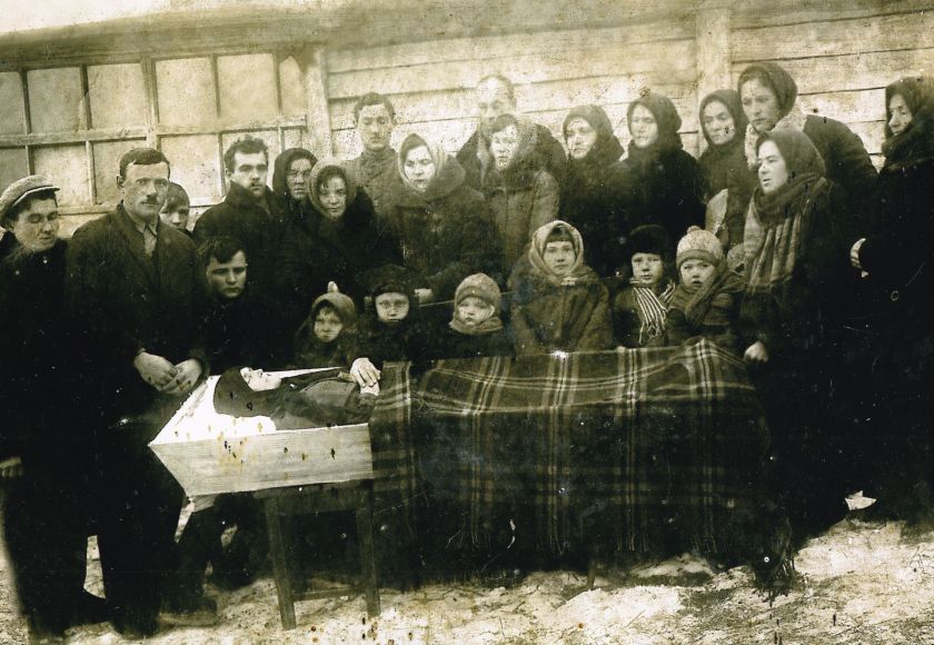 Úmrtí babičky Julie Švihlíkové/Kvardové, rok cca 1935, foceno u domu dědečka a babičky v Rožděstvenu na samotě, zleva Viktor Švihlík, Josef Švihlík s knírkem, u rakve děti 1. zprava Evžen, Kolja a Věra (děti Josefa Švihlíka), dále doleva děti příbuzných a vzadu zbytek rodiny. Předposlední zprava Švihlíková Helena a nad ní Švihlíková Naděžda