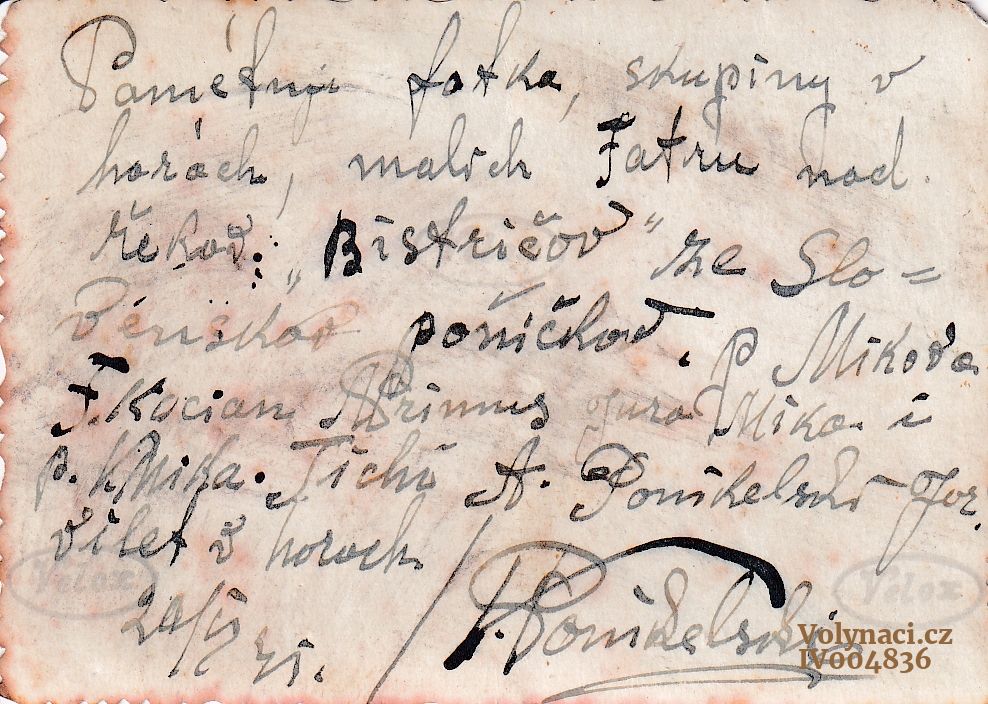 2. strana fotografie Skupinové foto bratranci Ponikelských čelní strana - první stojící zprava Jaroslav Ponikelský, třetí zleva Václav Ponikelský