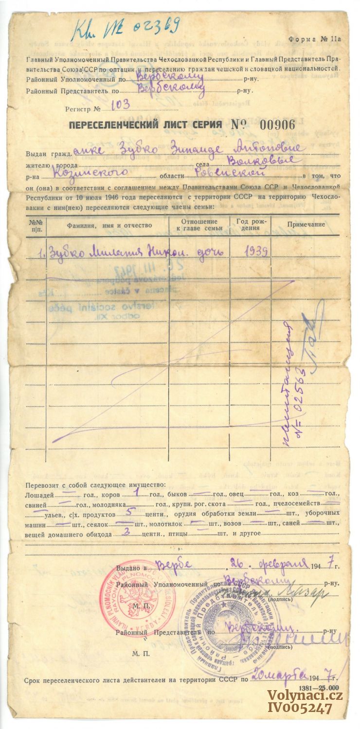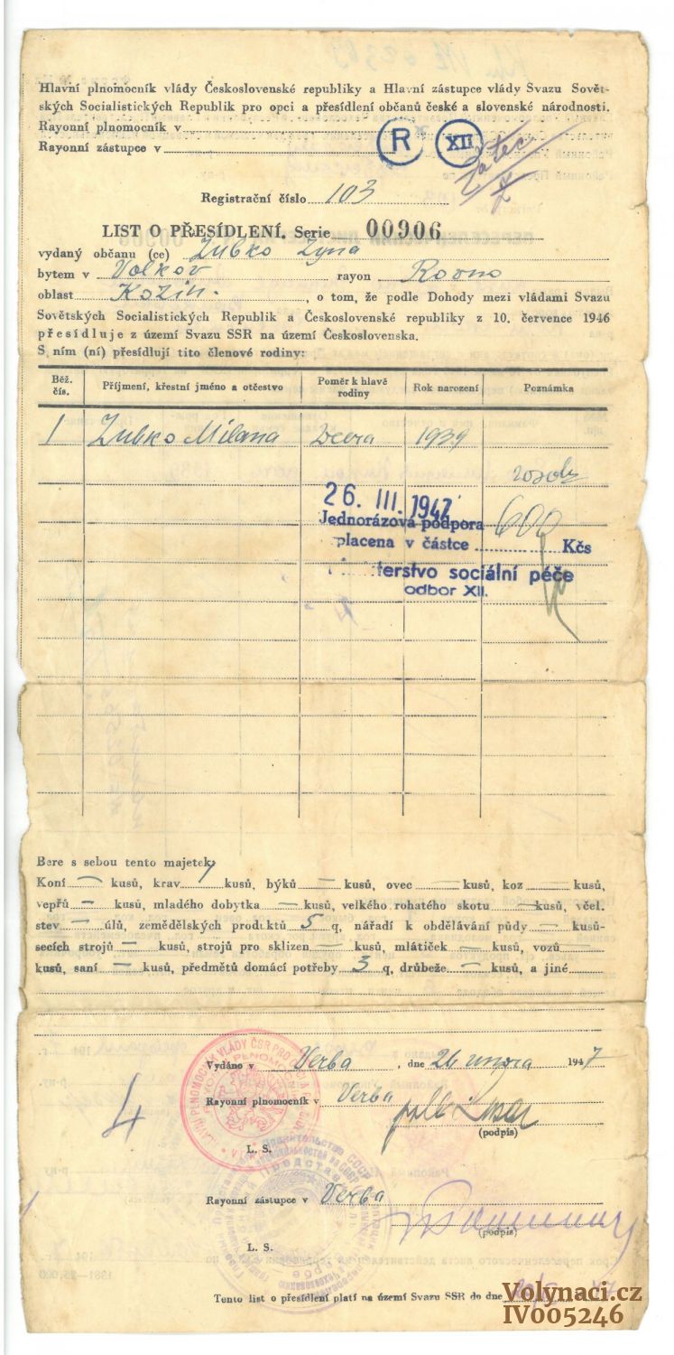 Migrační dokument - list o přesídlení, obsahoval i stručný soupis majetku, který si sebou vezli do Čech., Rok: 1947, Zdroj: Archiv Vlastislavy Srbecké Zubkové, Inventární číslo: IV005247