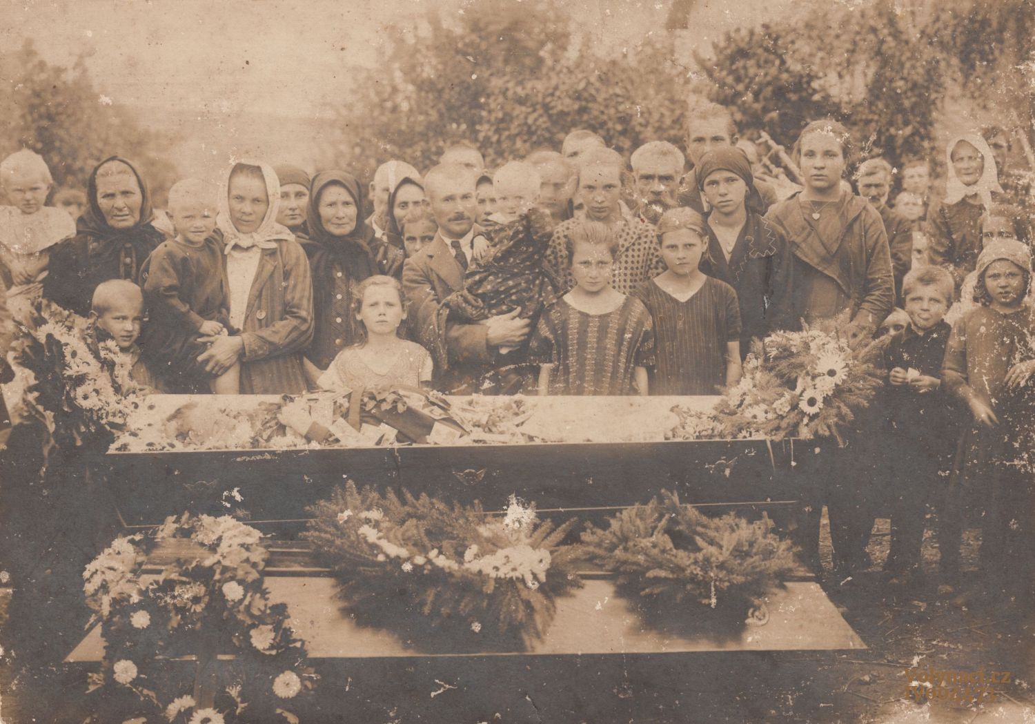 Pohřeb Marie Šimáčkové rozené Hrdličkové. Z fotografie je vidět, že zemřela s nenarozeným dítětem ještě na Volyni.