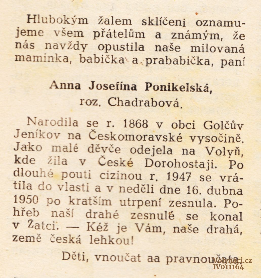 Nekrolog Anny Ponikelské z Č.Dorohostají