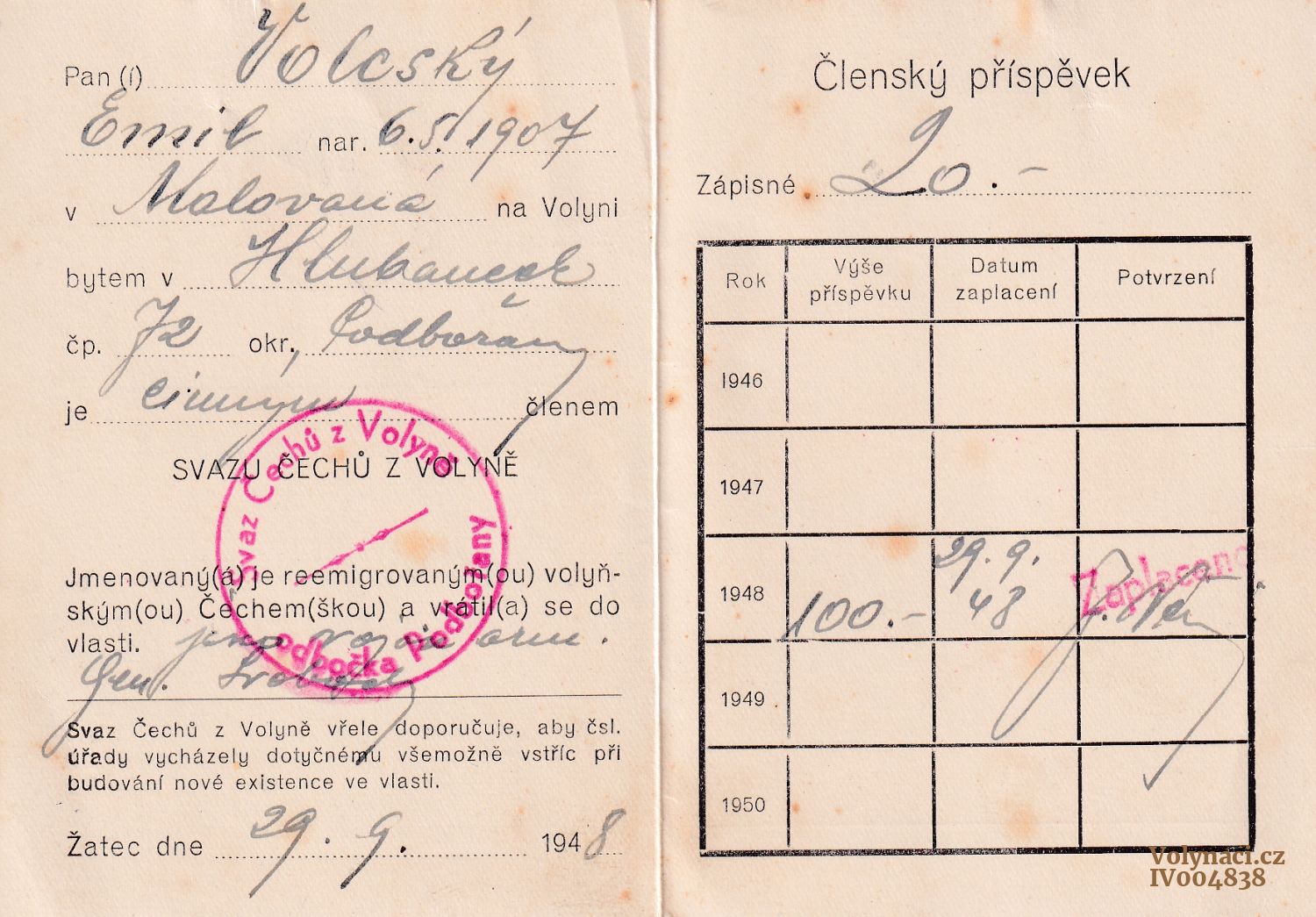 Číslo repatriačního průkazu: 14890 |