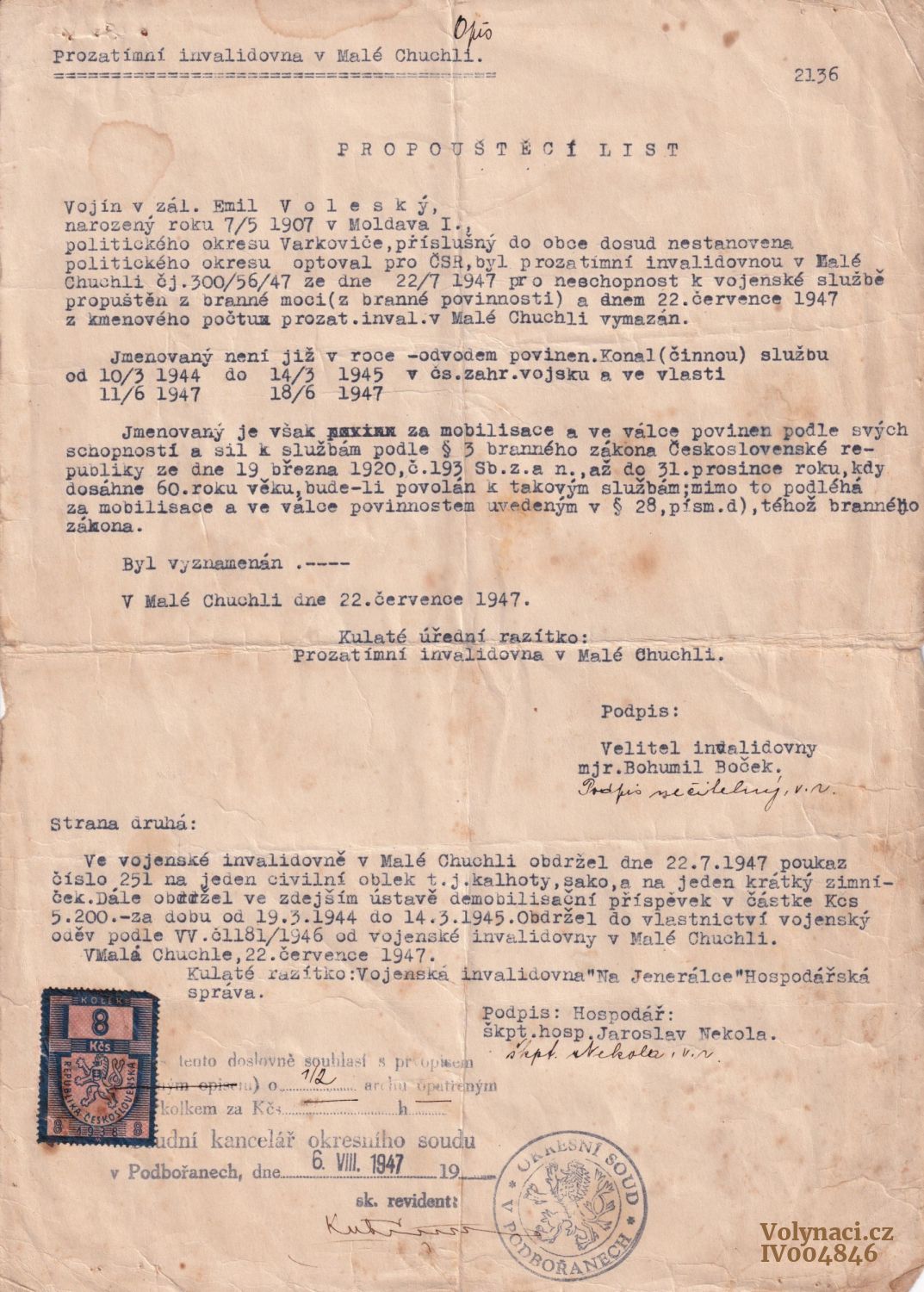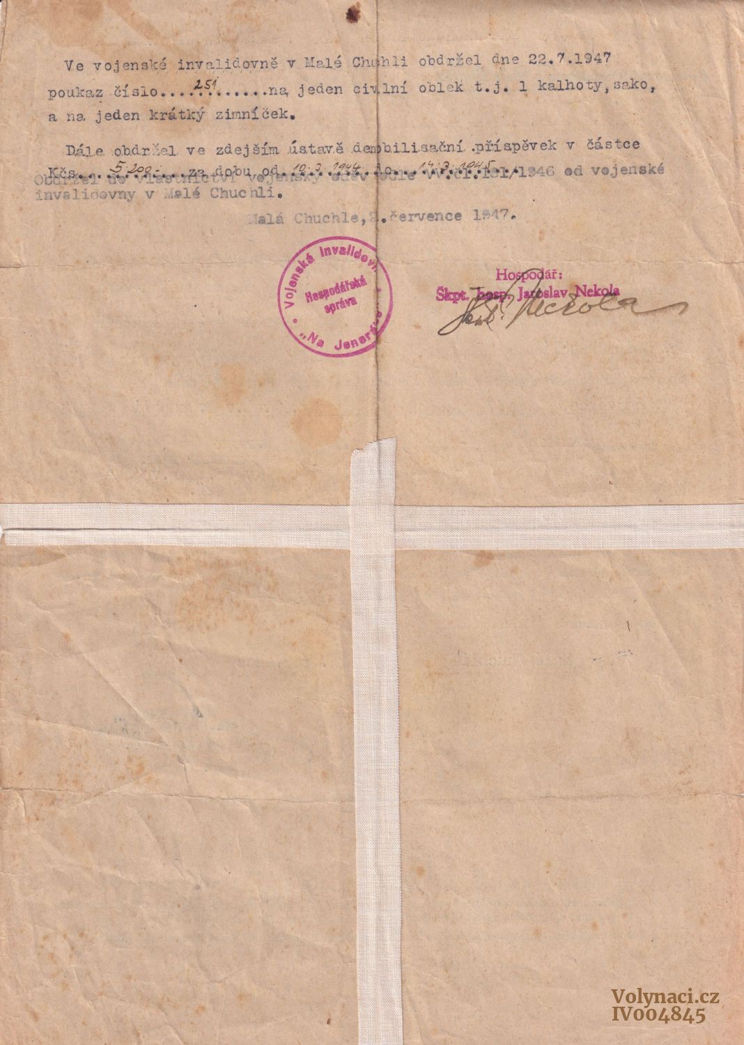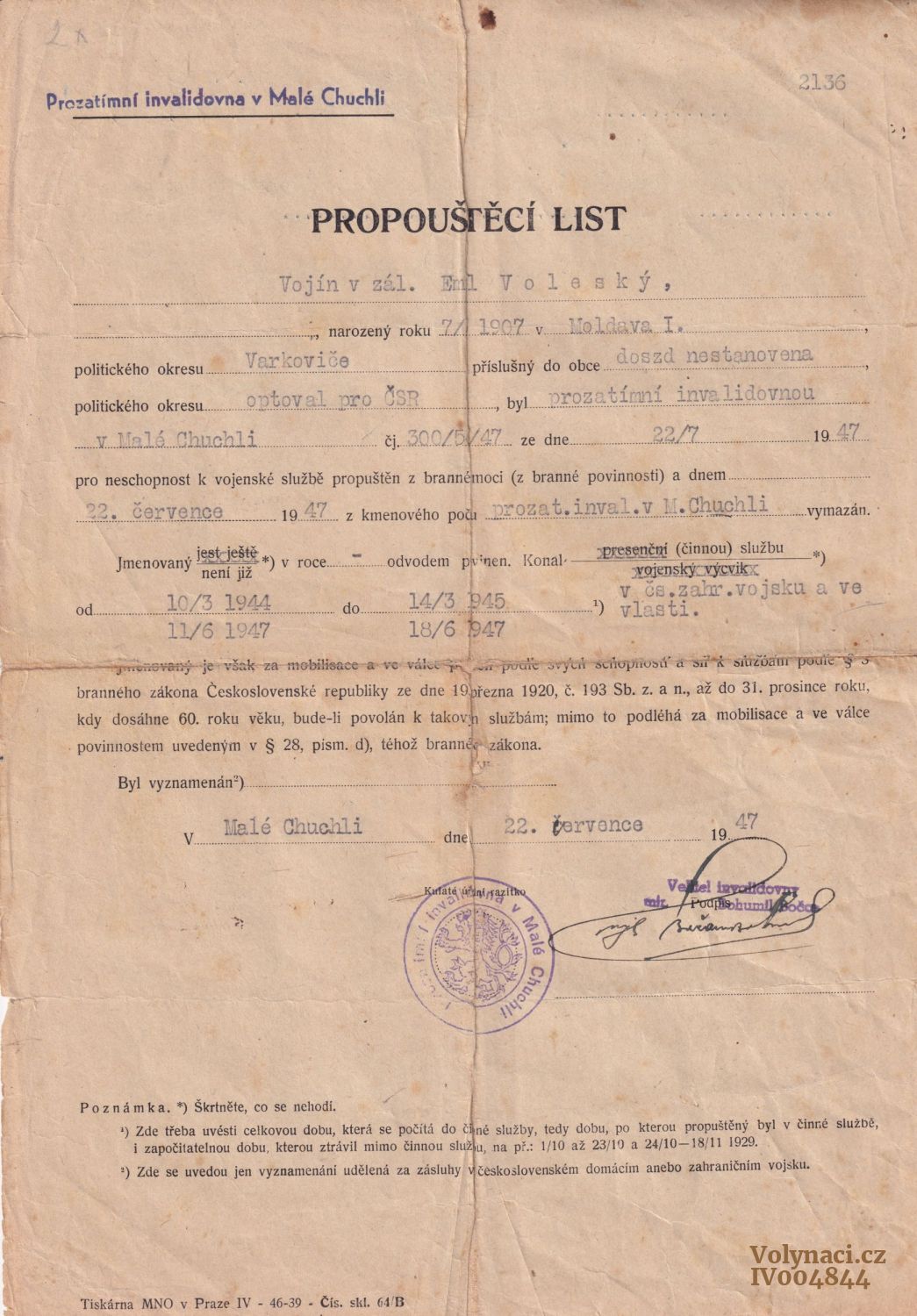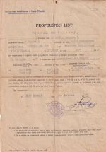 Propouštěcí list (invalidovna). Poukaz na civilní oděv a jednorázový fin. příspěvek.