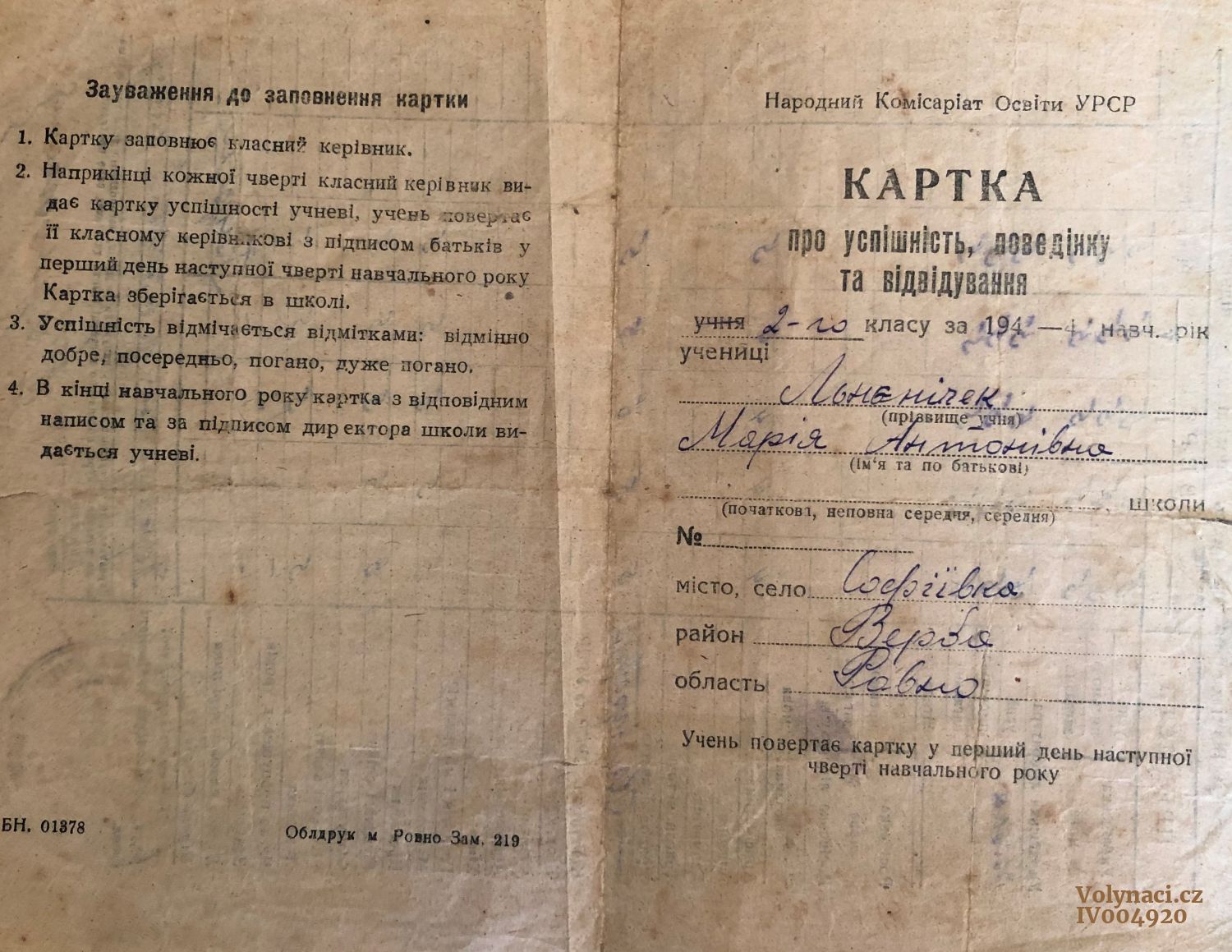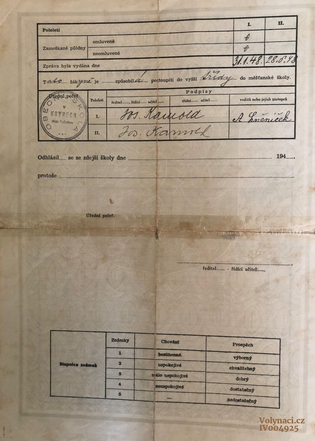 Poslední školní vysvědčení na Volyni, Rok: 1947, Zdroj: Stanislav Sabol z vlastního archivu, Inventární číslo: IV004922