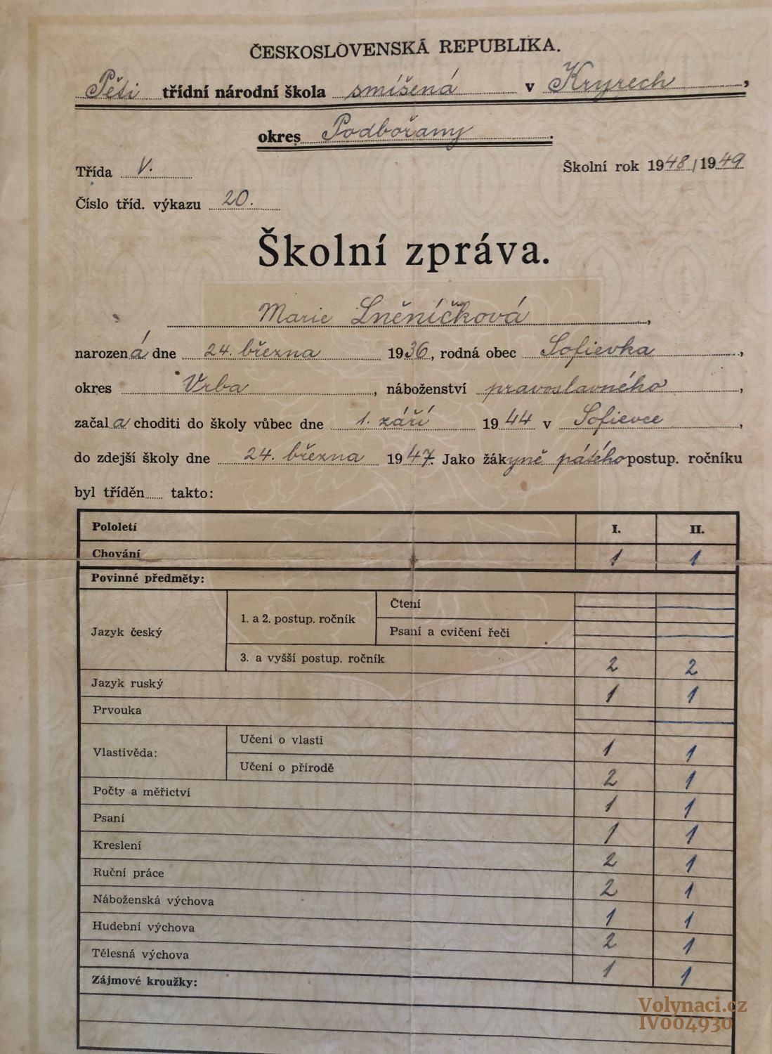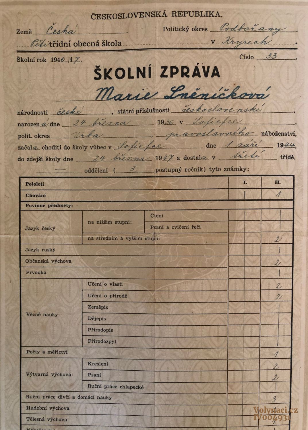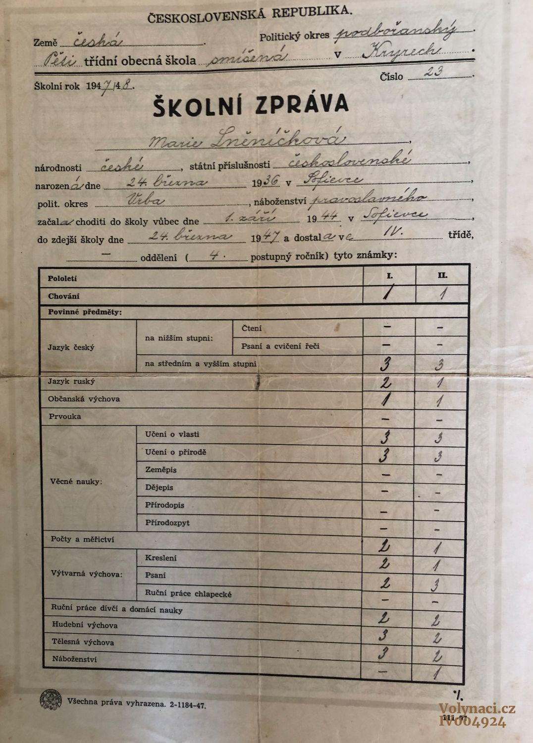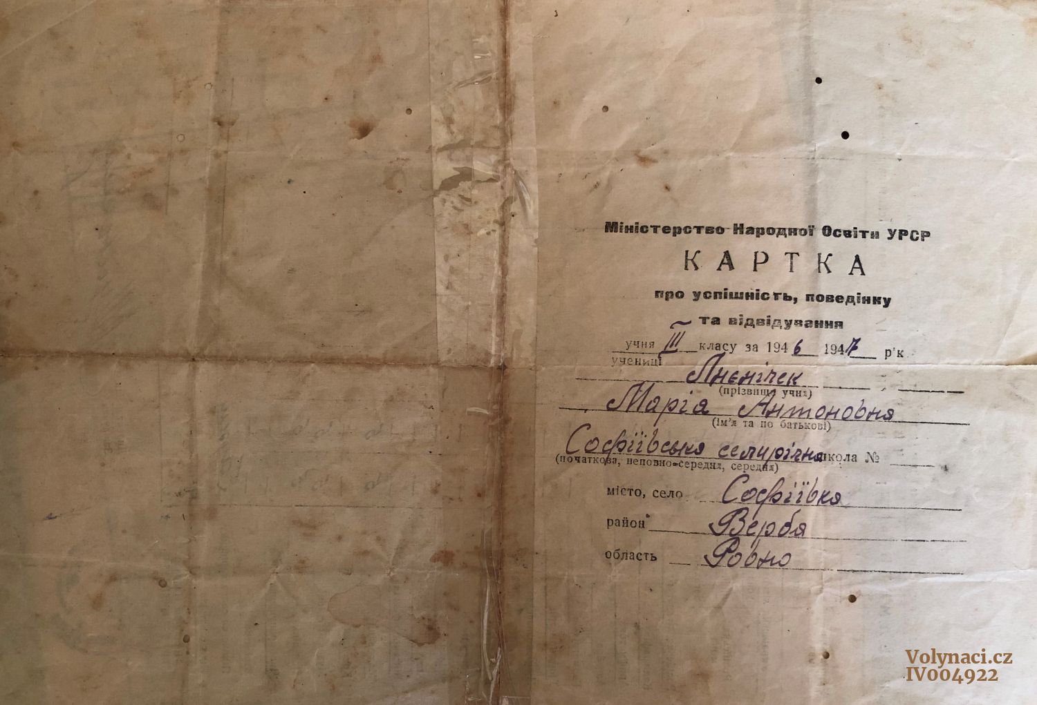 Poslední školní vysvědčení na Volyni, Rok: 1947, Zdroj: Stanislav Sabol z vlastního archivu, Inventární číslo: IV004923