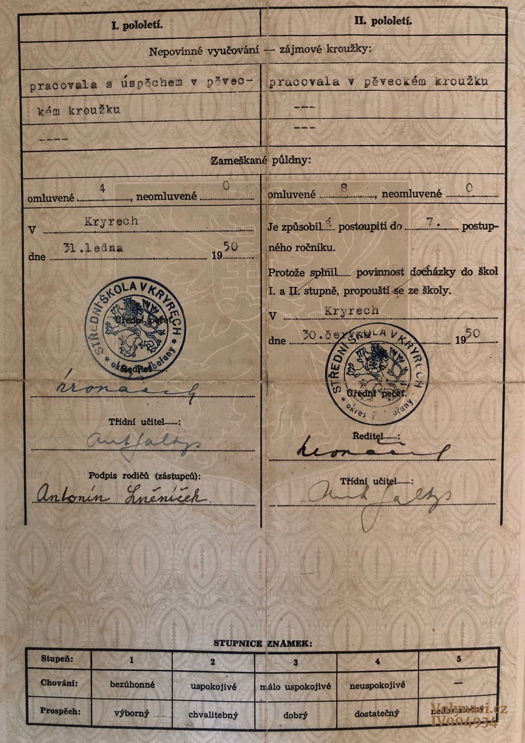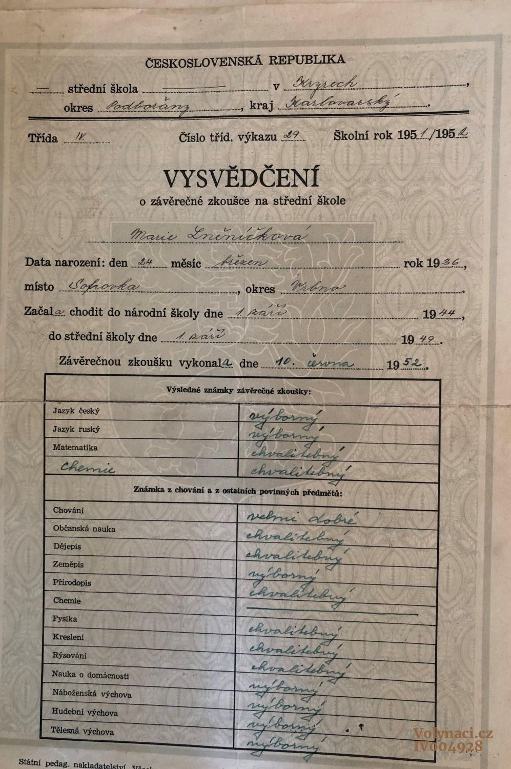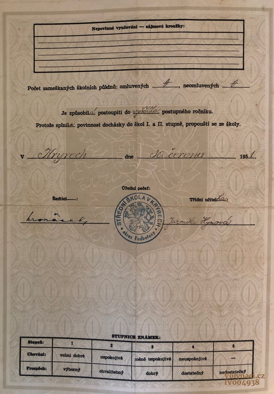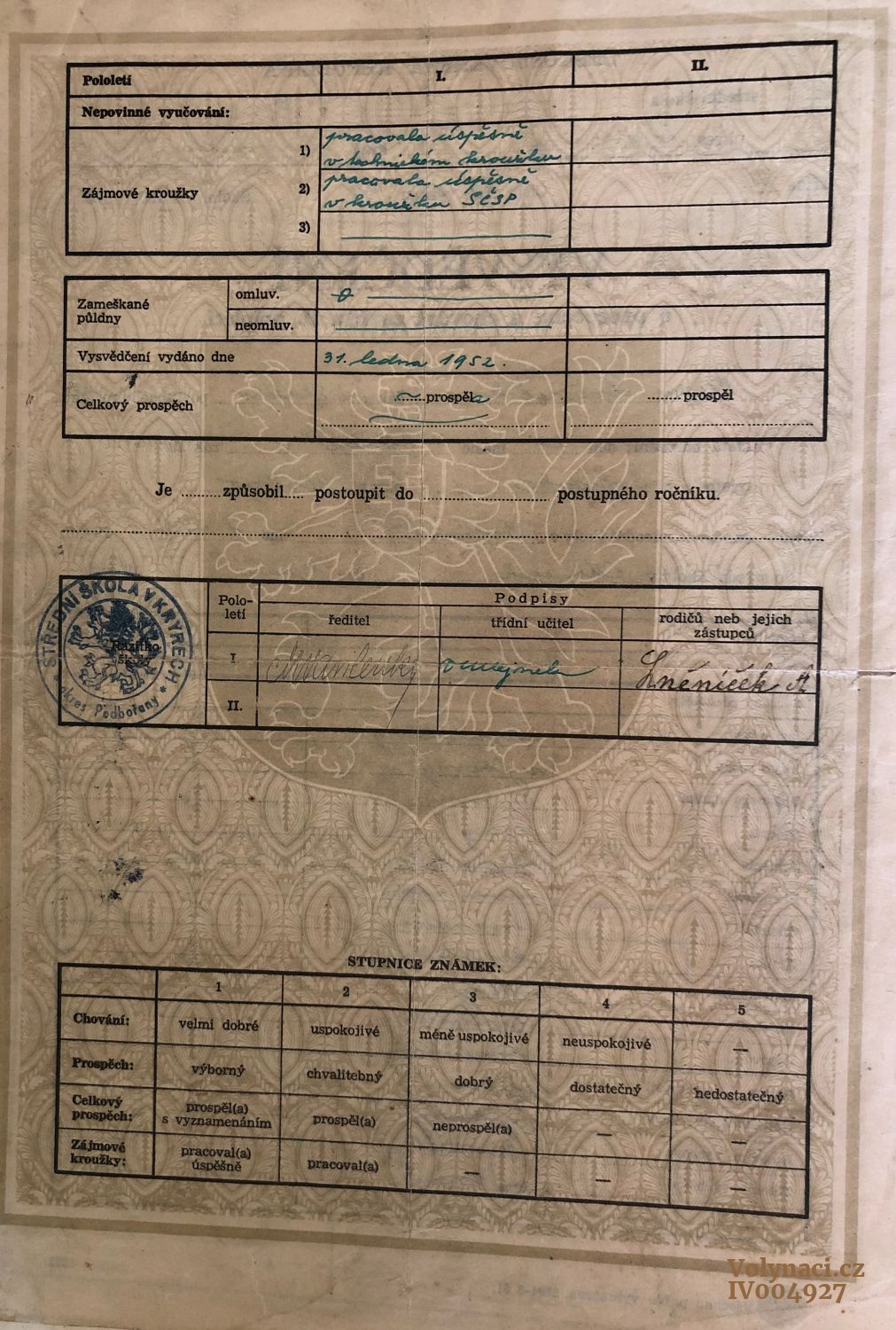 Školní vysvědčení, Rok: 1952, Zdroj: Stanislav Sabol z vlastního archivu, Inventární číslo: IV004927