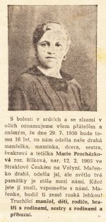 Nekrolog Marie Procházkové z Českého Straklova na Volyni.