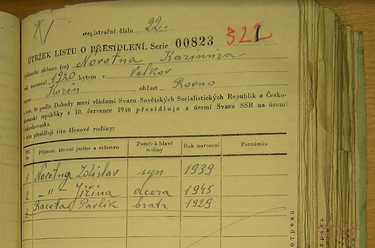 detail listu o přesídlení rodiny Kazimíry Novotné a jejího bratra