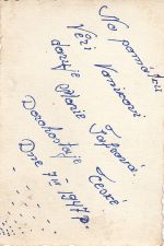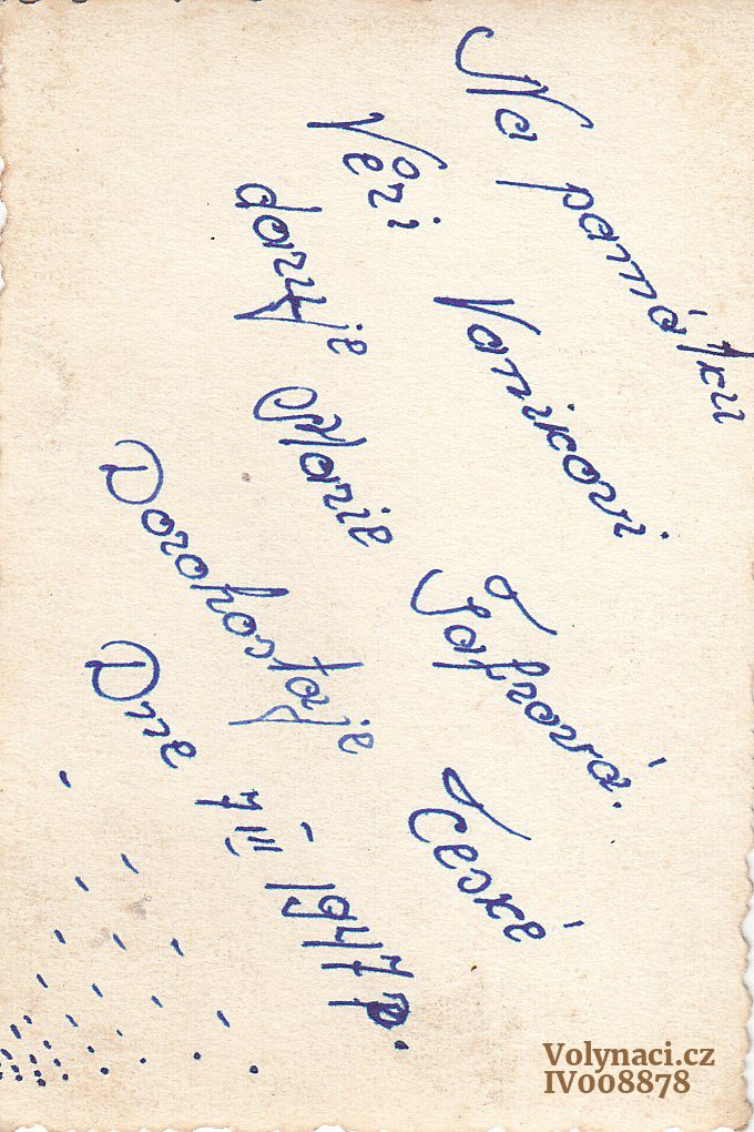 Z rubu text: Na památku Věri Vaníkové věnuje Marie Šafrová. Dorohostaje České dne 7.III.1947, Rok: 1947, Zdroj: Archiv Antonie Švobové, roz. Vaníkové, Inventární číslo: IV008877